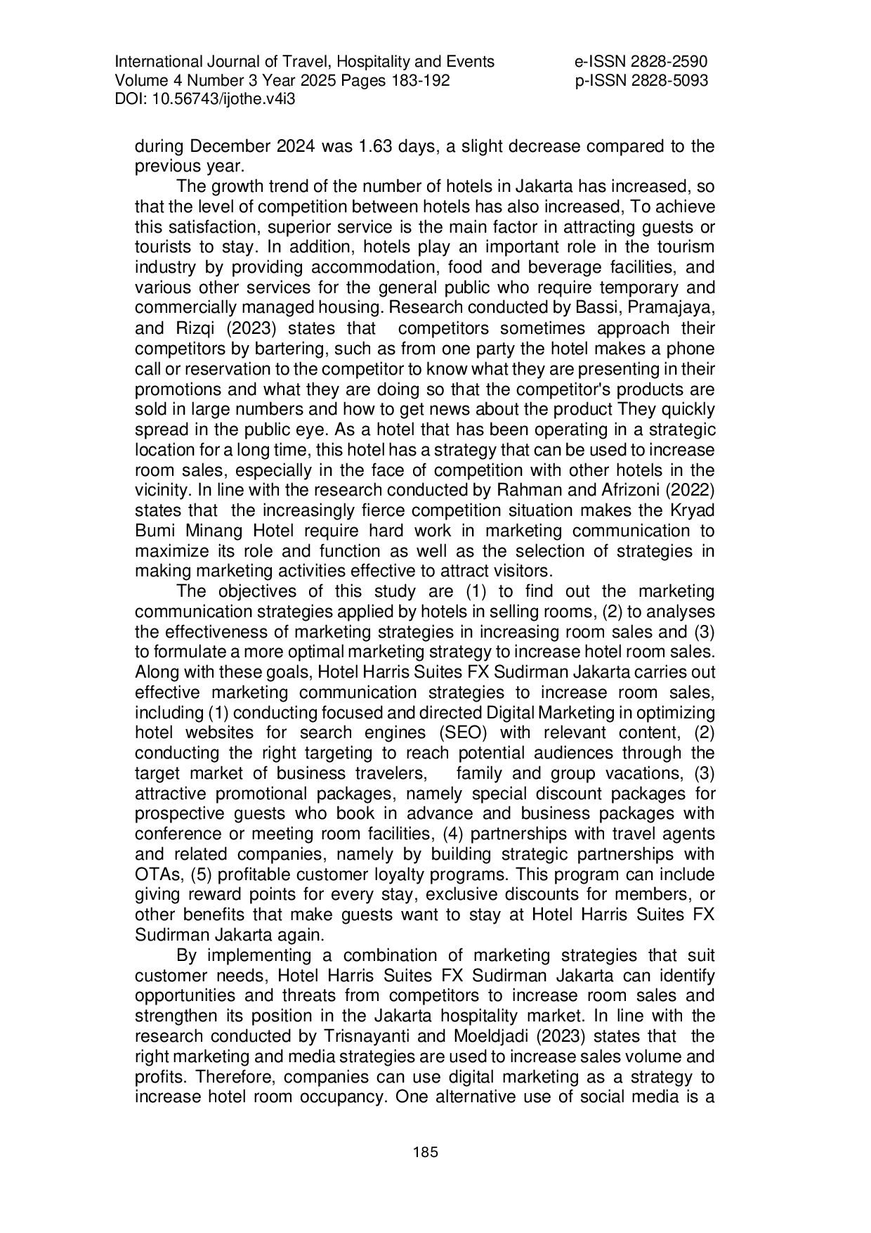 International Journal of Travel, Hospitality and EventsInternational Journal of Travel, Hospitality and EventsPurpose: This study analyzes marketing communication strategies in increasing hotel room sales. Marketing communication strategies used include digital marketing, package improvements, and promotion, strategic partnerships, community-based approaches. This study aims to find out effective marketing communication strategies to be applied in the sale of hotel rooms.. Research Methode: The research method employs a descriptive qualitative approach, with marketing informants and hotel guests at Harris Suites FX Jakarta as participants. Data were collected through interviews with informants and observation activities.. Result and Discussion: The findings of this study show that the implementation of an effective marketing communication strategy greatly affects the sales rate of rooms Harris Suites FX Jakarta. The use of social media such as Instagram, TikTok, and websites has proven to be effective in reaching out to potential guests widely and increasing the attraction of guests to stay at Harris Suites FX Jakarta. An integrated and responsive communication approach to technological developments has strengthened the brand image and significantly expanded the hotels market share.