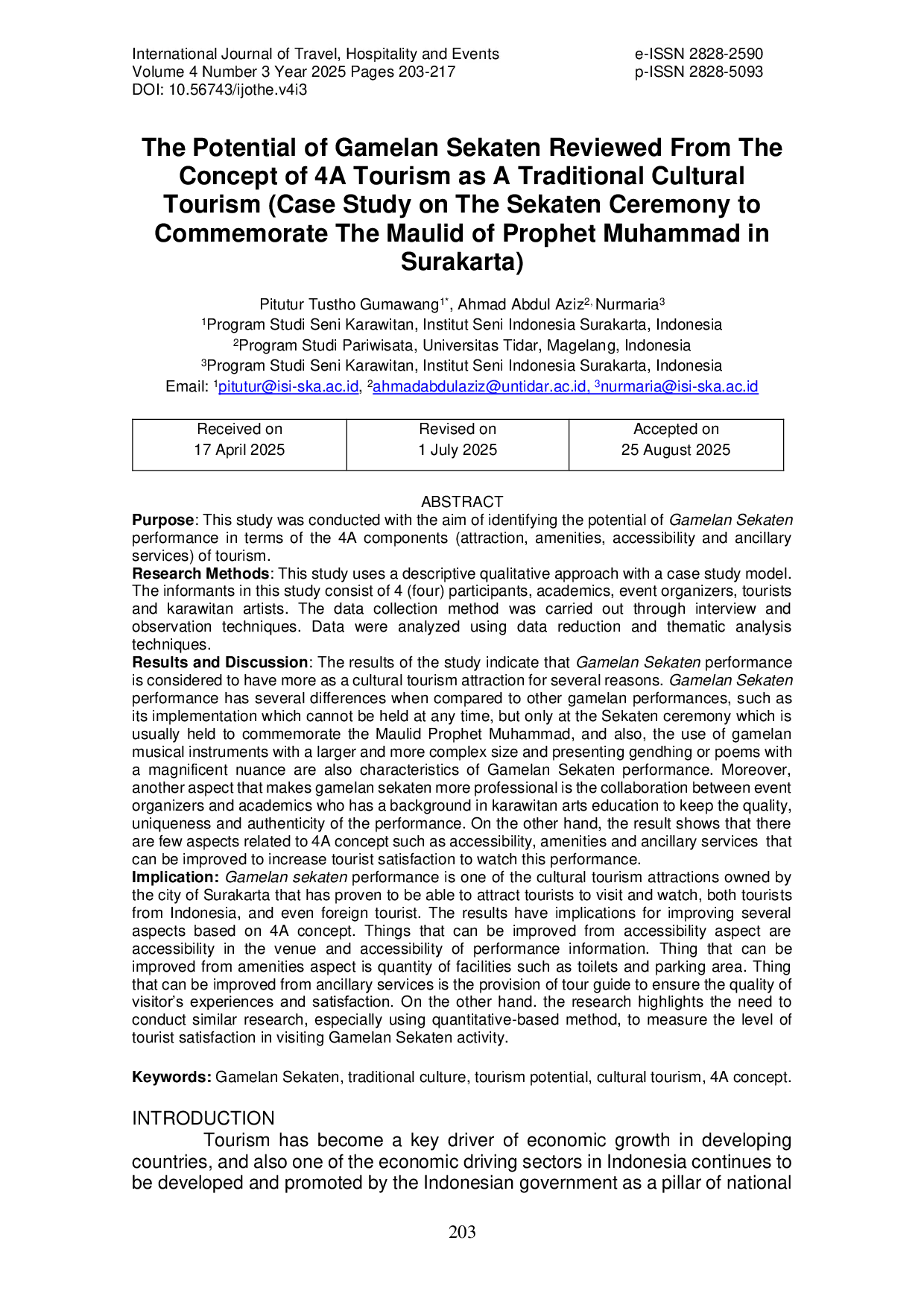 International Journal of Travel, Hospitality and EventsInternational Journal of Travel, Hospitality and EventsPenelitian ini bertujuan untuk mengidentifikasi potensi pertunjukan Gamelan Sekaten dalam komponen 4A (atraksi, fasilitas, aksesibilitas, dan layanan pendukung) pariwisata. Penelitian ini menggunakan pendekatan kualitatif deskriptif dengan model studi kasus. Informan dalam penelitian ini terdiri dari empat peserta, yaitu akademisi, penyelenggara acara, wisatawan, dan seniman karawitan. Pengumpulan data dilakukan melalui teknik wawancara dan observasi. Data dianalisis menggunakan teknik reduksi data dan analisis tematik. Hasil penelitian menunjukkan bahwa pertunjukan Gamelan Sekaten dianggap memiliki potensi sebagai atraksi wisata budaya karena beberapa alasan. Pertunjukan Gamelan Sekaten memiliki perbedaan dengan pertunjukan gamelan lainnya, seperti pelaksanaannya yang tidak dapat dilakukan kapan saja, tetapi hanya pada upacara Sekaten yang biasanya diadakan untuk memperingati Maulid Nabi Muhammad, dan penggunaan alat musik gamelan dengan ukuran dan kompleksitas yang lebih besar serta menyajikan gendhing atau puisi dengan nuansa megah. Selain itu, kolaborasi antara penyelenggara acara dan akademisi yang memiliki latar belakang pendidikan seni karawitan untuk menjaga kualitas, keunikan, dan keaslian pertunjukan juga menjadi faktor pendukung. Namun, hasil penelitian juga menunjukkan bahwa ada beberapa aspek terkait konsep 4A seperti aksesibilitas, fasilitas, dan layanan pendukung yang dapat ditingkatkan untuk meningkatkan kepuasan wisatawan dalam menonton pertunjukan ini.