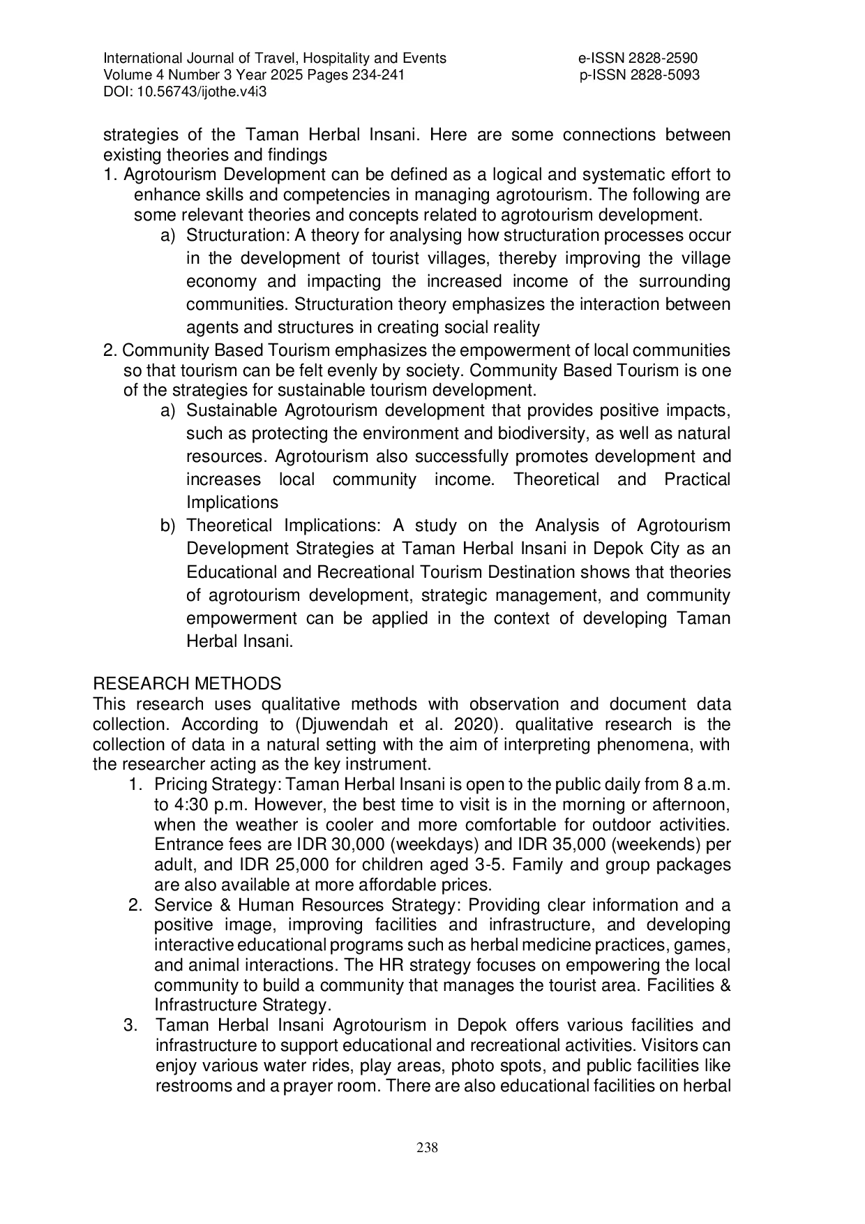 International Journal of Travel, Hospitality and EventsInternational Journal of Travel, Hospitality and EventsPenelitian ini bertujuan untuk menganalisis strategi pengembangan Taman Herbal Insani di Kota Depok sebagai destinasi wisata edukasi dan rekreasi. Studi ini menggunakan metode kualitatif dengan teknik pengumpulan data dokumentasi dan observasi. Taman Herbal Insani memiliki kekuatan signifikan dalam hal koleksi tanaman herbal yang luas dan fasilitas yang lengkap, namun memiliki kelemahan dalam hal promosi dan aksesibilitas. Taman Herbal Insani memiliki potensi untuk dikembangkan dengan menggunakan strategi pengembangan yang terencana dengan baik, sehingga dapat meningkatkan daya tarik pengunjung dan menarik lebih banyak pengunjung, menciptakan pengalaman yang tak terlupakan bagi wisatawan, mengembangkan fasilitas kegiatan yang lebih menarik dan edukatif, meningkatkan kualitas layanan, dan menjalin kerjasama dengan lembaga pendidikan. Hasil penelitian menunjukkan bahwa Agrowisata Taman Herbal Insani di kota Depok memiliki potensi besar sebagai destinasi wisata edukasi dan rekreasi yang unik, tetapi masih menghadapi beberapa tantangan. Salah satu alternatif untuk mengatasi tantangan ini adalah dengan mengembangkan sektor pertanian yang dikombinasikan dengan sektor pariwisata.