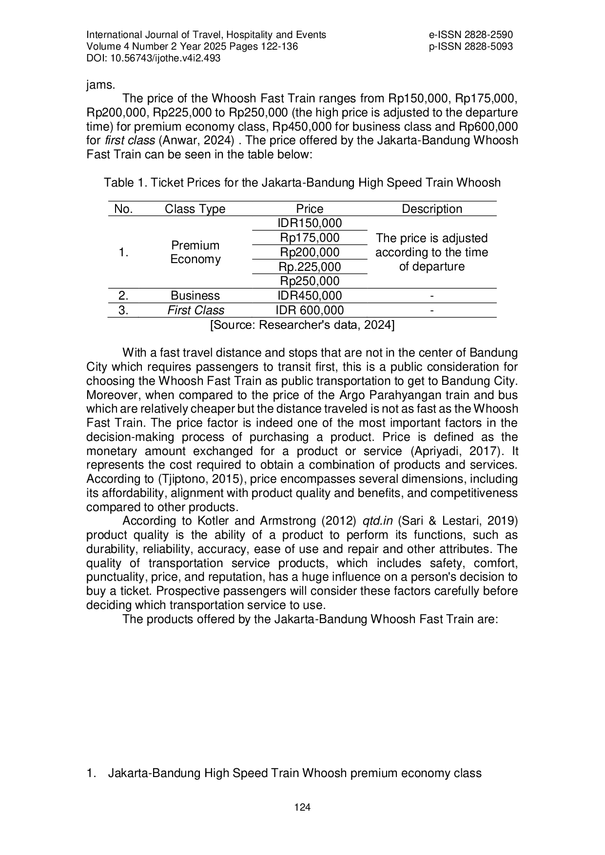 International Journal of Travel, Hospitality and EventsInternational Journal of Travel, Hospitality and EventsTujuan penelitian ini adalah untuk menentukan apakah kualitas produk dan harga tiket memiliki pengaruh parsial dan simultan terhadap keputusan pembelian pengguna Kereta Cepat Whoosh Jakarta-Bandung. Metode penelitian yang digunakan adalah kuantitatif. Pengumpulan data dilakukan dengan kuesioner kepada 100 responden yang telah menggunakan Kereta Cepat Whoosh Jakarta-Bandung. Metode analisis yang digunakan adalah Analisis Regresi Linear Berganda, Uji T, dan Uji F. Hasil penelitian menunjukkan bahwa kualitas produk dan harga secara parsial dan simultan memiliki pengaruh positif dan signifikan terhadap keputusan pembelian. Selain itu, uji koefisien determinan menunjukkan bahwa kualitas produk dan harga memiliki kontribusi sebesar 57,9% dalam mempengaruhi keputusan pembelian. Sementara itu, 42,1% lainnya adalah variabel independen lain yang tidak termasuk dalam penelitian ini.