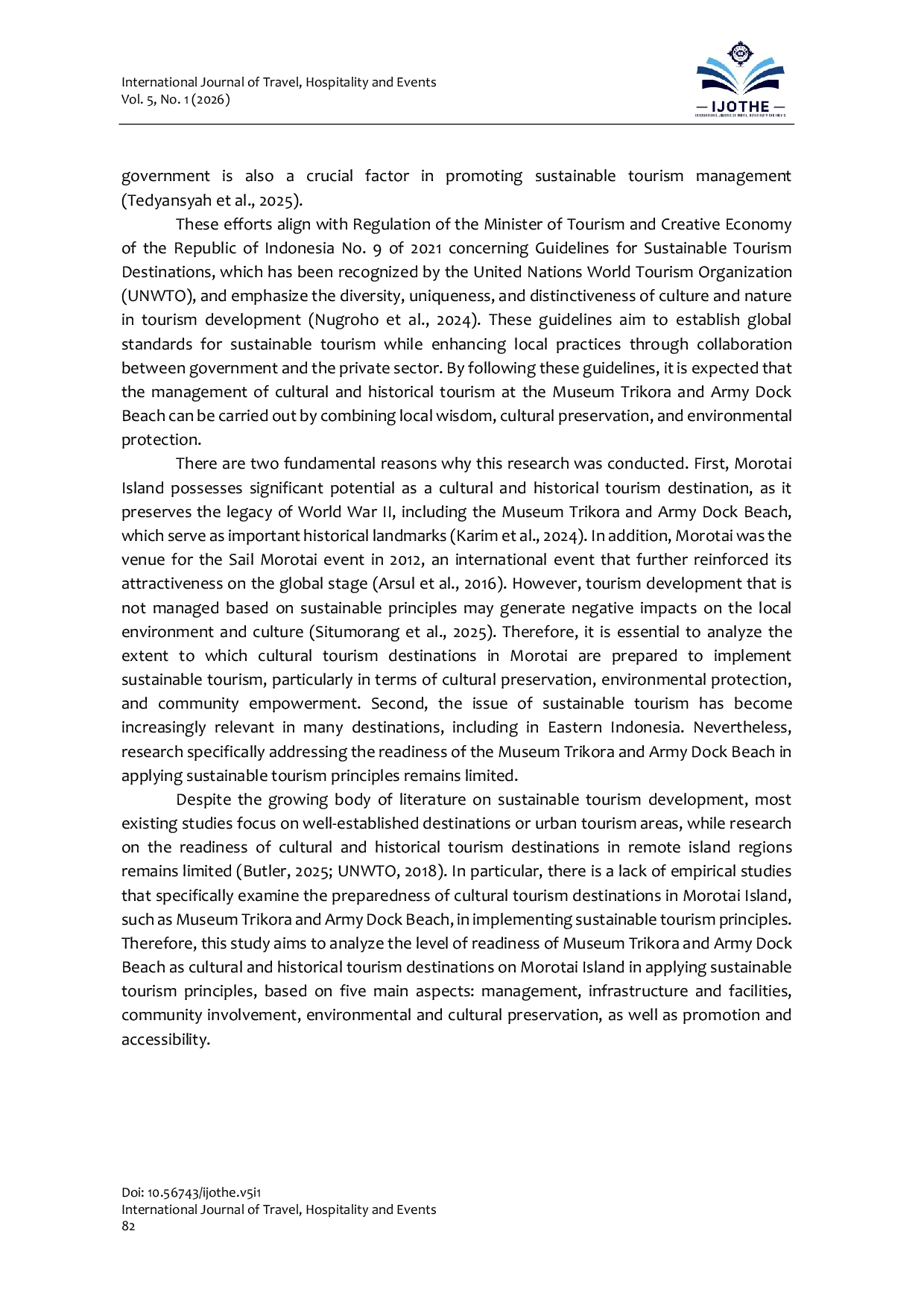 International Journal of Travel, Hospitality and EventsInternational Journal of Travel, Hospitality and EventsThis study analyzes the readiness of cultural tourism destinations on Morotai Island, specifically Museum Trikora and Army Dock Beach, in implementing the principles of sustainable tourism. These two destinations were selected due to their high historical value, although their management and supporting facilities have not been optimally developed. This research employs a qualitative descriptive approach, with data collected through observation, interviews, and documentation. The findings indicate that both destinations are not fully prepared to apply sustainable tourism principles. Museum Trikora faces issues related to damaged facilities, limited maintenance, and restrictions on activities due to land ownership, while Army Dock Beach lacks official management, adequate infrastructure, and proper environmental maintenance. In addition, community involvement and coordination among relevant agencies remain limited. Based on analysis of five main aspects, including management, infrastructure and facilities, community involvement, environmental and cultural preservation, as well as promotion and accessibility, the level of understanding and participation of local communities and managers in sustainable tourism practices remains relatively low. Therefore, strengthening destination management, enhancing active community participation, and improving supporting facilities are essential steps toward achieving sustainable cultural tourism development on Morotai Island.