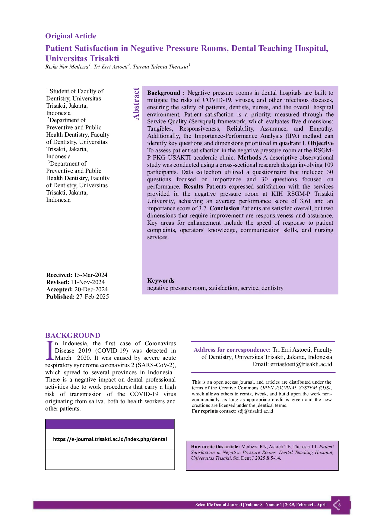 Scientific Dental JournalScientific Dental JournalBackground: Negative pressure rooms in dental hospitals are built to mitigate the risks of COVID-19, viruses, and other infectious diseases, ensuring the safety of patients, dentists, nurses, and the overall hospital environment. Patient satisfaction is a priority, measured through the Service Quality (Servqual) framework, which evaluates five dimensions: Tangibles, Responsiveness, Reliability, Assurance, and Empathy. Additionally, the Importance-Performance Analysis (IPA) method can identify key questions and dimensions prioritized in quadrant I. Objective: To assess patient satisfaction in the negative pressure room at the RSGM-P FKG USAKTI academic clinic. Methods: A descriptive observational study was conducted using a cross-sectional research design involving 109 participants. Data collection utilized a questionnaire that included 30 importance and 30 questions focused on performance. Results: Patients expressed satisfaction with the services provided in the negative pressure room at KIH RSGM-P Trisakti University, achieving an average performance score of 3.61 and an importance score of 3.7. Conclusion: Patients are satisfied overall, but two dimensions that require improvement are responsiveness and assurance.