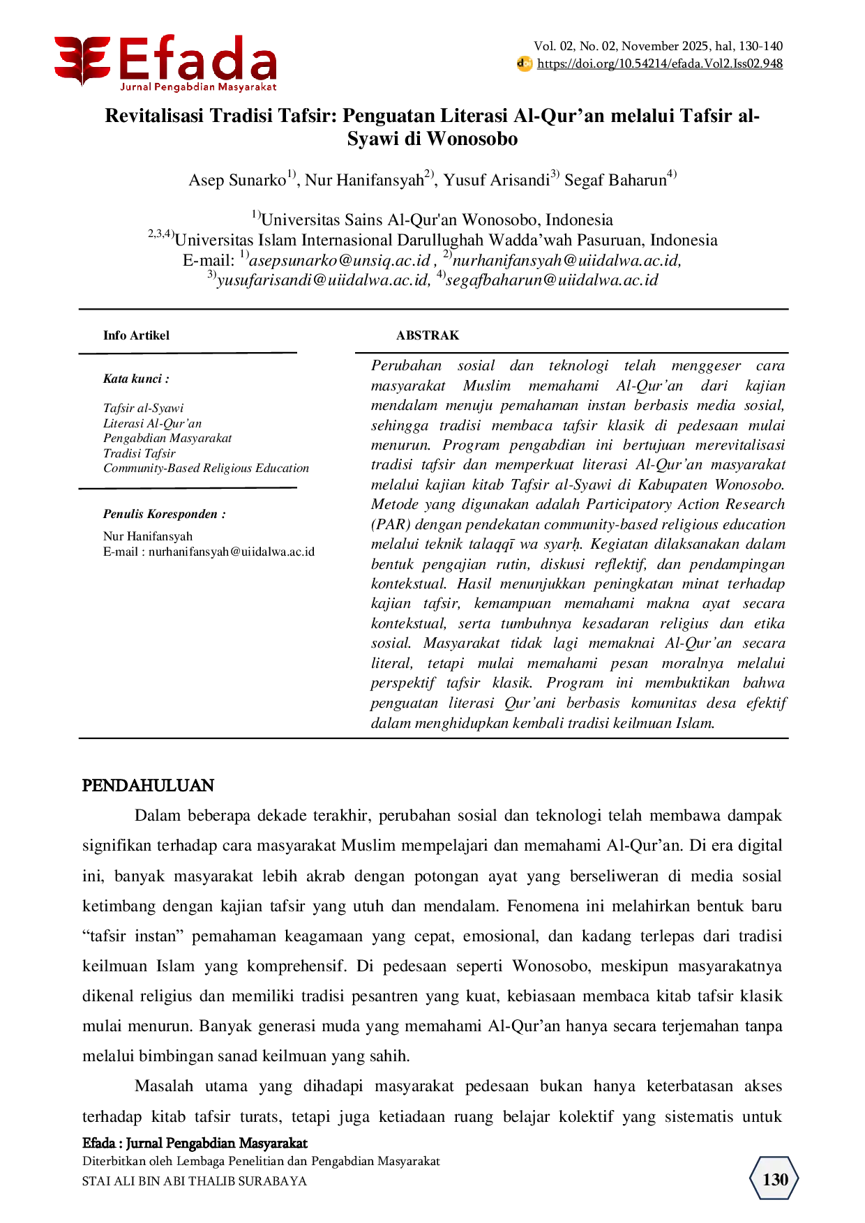 Efada : Jurnal Pengabdian MasyarakatEfada : Jurnal Pengabdian MasyarakatPerubahan sosial dan teknologi telah menggeser cara masyarakat Muslim memahami Al-Quran dari kajian mendalam menuju pemahaman instan berbasis media sosial, sehingga tradisi membaca tafsir klasik di pedesaan mulai menurun. Program pengabdian ini bertujuan merevitalisasi tradisi tafsir dan memperkuat literasi Al-Quran masyarakat melalui kajian kitab Tafsir al-Syawi di Kabupaten Wonosobo. Metode yang digunakan adalah Participatory Action Research (PAR) dengan pendekatan community-based religious education melalui teknik talaqqī wa syarḥ. Kegiatan dilaksanakan dalam bentuk pengajian rutin, diskusi reflektif, dan pendampingan kontekstual. Hasil menunjukkan peningkatan minat terhadap kajian tafsir, kemampuan memahami makna ayat secara kontekstual, serta tumbuhnya kesadaran religius dan etika sosial. Masyarakat tidak lagi memaknai Al-Quran secara literal, tetapi mulai memahami pesan moralnya melalui perspektif tafsir klasik. Program ini membuktikan bahwa penguatan literasi Qurani berbasis komunitas desa efektif dalam menghidupkan kembali tradisi keilmuan Islam.