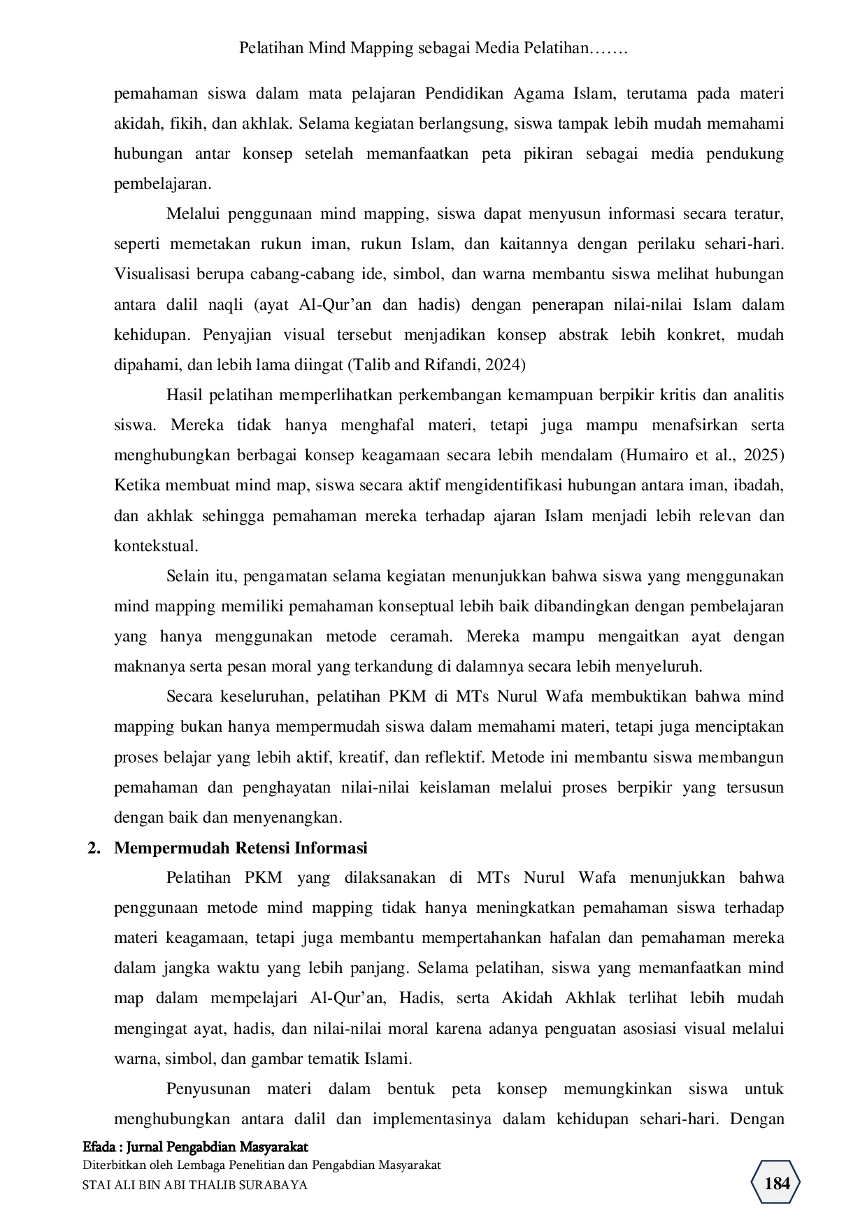 Efada : Jurnal Pengabdian MasyarakatEfada : Jurnal Pengabdian MasyarakatPelatihan mind mapping di MTs Nurul Wafa dilaksanakan sebagai upaya untuk meningkatkan kemampuan berpikir kritis, pemahaman materi, dan motivasi belajar siswa yang sebelumnya masih rendah akibat dominasi metode ceramah dan kurangnya variasi. Kegiatan ini menggunakan pendekatan kualitatif deskriptif dengan model partisipatif melalui serangkaian sesi mulai dari sosialisasi, pelatihan dasar, praktik pembuatan mind map, simulasi pembelajaran, hingga evaluasi. Hasil pelatihan menunjukkan bahwa siswa mengalami peningkatan signifikan dalam memahami konsep keagamaan seperti akidah, fiqih, akhlak, serta kandungan ayat dan hadis melalui visualisasi konsep yang lebih terstruktur. Penyusunan informasi dalam bentuk peta pikiran membuat siswa lebih mudah mengingat, menghubungkan konsep, serta memahami hubungan antardalil dengan penerapan nilai Islam dalam kehidupan sehari-hari. Selain itu, penggunaan warna, simbol, dan gambar tematik Islami mendorong siswa lebih terlibat aktif, kreatif, dan antusias selama proses belajar. Guru juga merasakan manfaat pelatihan dalam memperkaya metode mengajar sehingga proses pembelajaran menjadi lebih variatif, interaktif, dan sesuai dengan karakteristik siswa. Secara keseluruhan, pelatihan mind mapping terbukti efektif sebagai strategi pembelajaran inovatif untuk meningkatkan pemahaman materi, retensi informasi, motivasi belajar, dan kemampuan berpikir kritis siswa di MTs Nurul Wafa, sehingga layak dikembangkan sebagai model pembelajaran berkelanjutan.