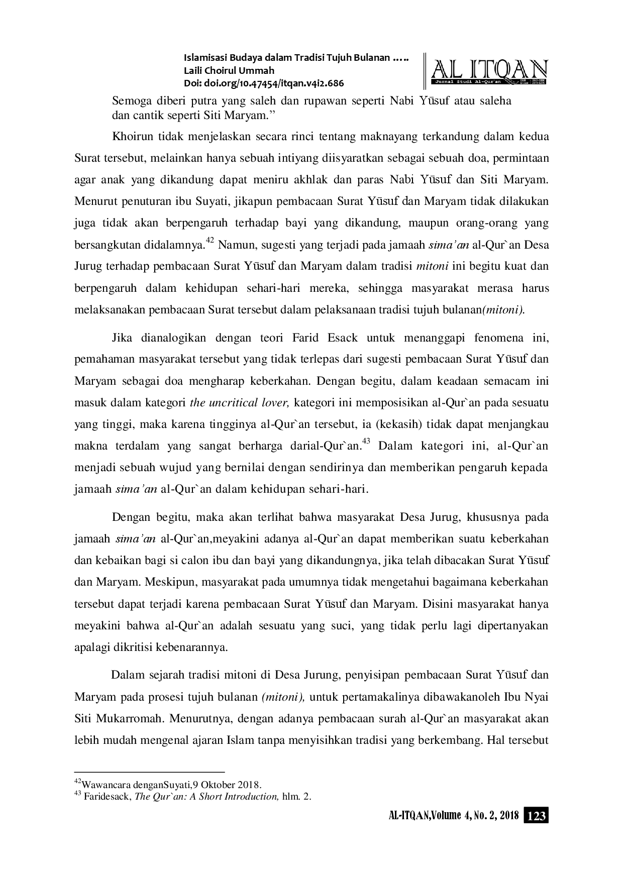 AL ITQAN: Jurnal Studi Al-Qur'anAL ITQAN: Jurnal Studi Al-Qur'anAkulturasi adalah proses sosial yang timbul dari suatu kebudayaan tertentu, kemudian dihadapkan dengan unsur‑unsur budaya lain, sehingga unsur‑unsur tersebut dapat diterima tanpa menghilangkan kepribadian budaya sendiri. Penelitian ini difokuskan pada interaksi al‑Quran dengan budaya Jawa, terutama pada prosesi tradisi yang mengalami Islamisasi, yakni tradisi mitoni di Desa Jurug, Kecamatan Mojosongo, Kabupaten Boyolali, Jawa Tengah, dimana al‑Quran dilibatkan dalam pelaksanaannya dalam bentuk pembacaan surah Yusuf dan Maryam. Dengan konsep akulturasi ini, akan dilihat bagaimana al‑Quran masuk dan berinteraksi secara langsung di kehidupan sehari‑hari masyarakat Desa Jurug. Konteks masyarakat Desa Jurug adalah masyarakat terbuka dan ramah akan ragam tradisi termasuk mitoni, sebuah tradisi yang dilestarikan secara turun temurun dengan maksud mendoakan janin yang dikandung ketika sudah berusia tujuh bulan. Bagi masyarakat Desa Jurug, pembacaan surah Yusuf dan Maryam pada tradisi mitoni diyakini sebagai penyambung doa yang akan mendatangkan kebaikan dan keberkahan bagi calon ibu dan bayi yang dikandungnya.