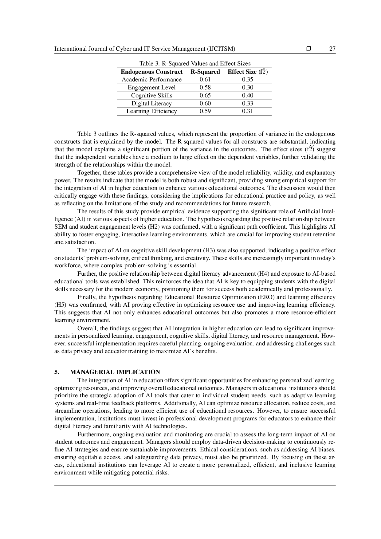 Temuan studi ini memberikan bukti empiris tentang peran penting Artificial Intelligence (AI) dalam berbagai aspek pendidikan tinggi.Hipotesis mengenai hubungan positif antara SEM dan tingkat partisipasi siswa (H2) dikonfirmasi, dengan koefisien jalur yang signifikan.Hal ini menunjukkan kemampuan AI untuk menciptakan lingkungan pembelajaran yang menarik dan interaktif, yang sangat penting untuk meningkatkan retensi dan kepuasan siswa.Dampak AI terhadap pengembangan keterampilan kognitif (H3) juga didukung, menunjukkan efek positif pada kemampuan siswa dalam pemecahan masalah, berpikir kritis, dan kreativitas.Keterampilan-keterampilan ini semakin penting dalam angkatan kerja saat ini, di mana pemecahan masalah kompleks menjadi hal yang esensial.Lebih lanjut, hubungan positif antara kemajuan literasi digital (H4) dan paparan alat pendidikan berbasis AI telah terjalin.Hal ini memperkuat gagasan bahwa AI adalah kunci untuk melengkapi siswa dengan keterampilan digital yang diperlukan untuk ekonomi modern, sehingga mereka siap secara akademis dan profesional.Akhirnya, hipotesis mengenai Optimasi Sumber Daya Pendidikan (ERO) dan efisiensi pembelajaran (H5) dikonfirmasi, dengan AI terbukti efektif dalam mengoptimalkan penggunaan sumber daya dan meningkatkan efisiensi pembelajaran.Hal ini menunjukkan bahwa AI tidak hanya meningkatkan hasil pendidikan tetapi juga mempromosikan lingkungan pembelajaran yang lebih efisien dalam penggunaan sumber daya.Secara keseluruhan, temuan menunjukkan bahwa integrasi AI dalam pendidikan tinggi dapat mengarah pada peningkatan signifikan dalam pembelajaran yang disesuaikan, partisipasi, keterampilan kognitif, literasi digital, dan manajemen sumber daya.Namun, implementasi yang sukses memerlukan perencanaan yang cermat, evaluasi berkelanjutan, dan penanganan tantangan seperti privasi data dan pelatihan pendidik untuk memaksimalkan manfaat AI.
