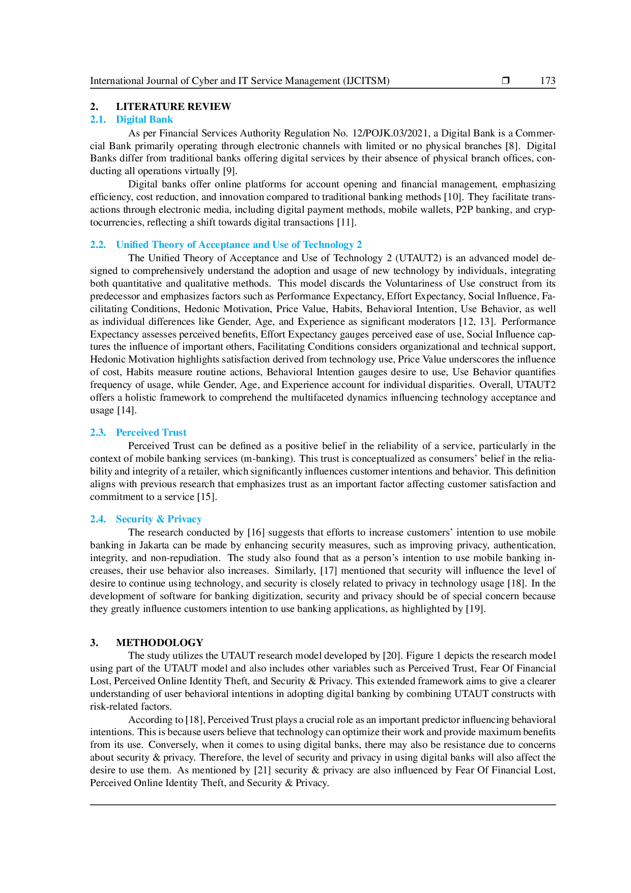 International Journal of Cyber and IT Service Management (IJCITSM)International Journal of Cyber and IT Service Management (IJCITSM)Penelitian ini bertujuan untuk memahami faktor-faktor utama yang mendasari pemilihan bank digital oleh pengguna di Indonesia. Model penelitian menggunakan kerangka UTAUT (Unified Theory of Acceptance and Use of Technology) yang dimodifikasi dengan penambahan variabel Perceived Trust, Fear Of Financial Lost, Perceived Online Identity Theft, dan Security & Privacy Concern. Sebanyak 434 responden yang menggunakan aplikasi bank digital dianalisis menggunakan teknik PLS-SEM melalui perangkat lunak SmartPLS 4. Hasil menunjukkan bahwa faktor Performance Expectancy, Social Influence, dan Perceived Trust merupakan pendorong utama terhadap niat perilaku. Sementara itu, variabel Effort Expectancy, Fear Of Financial Lost, dan Perceived Online Identity Theft tidak menunjukkan pengaruh yang signifikan. Temuan ini memberikan wawasan strategis untuk meningkatkan adopsi layanan perbankan digital di Indonesia.