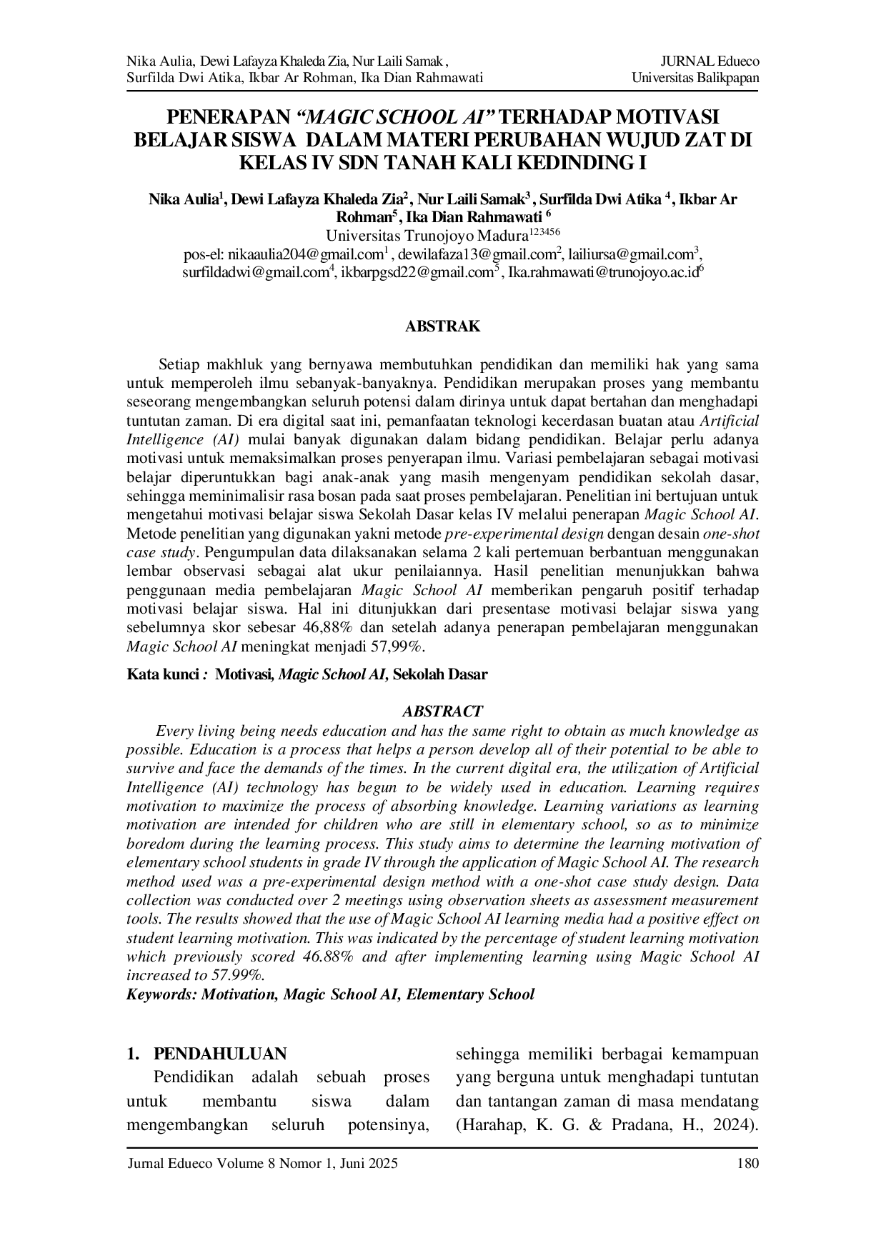 Jurnal EduecoJurnal EduecoSetiap makhluk yang bernyawa membutuhkan pendidikan dan memiliki hak yang sama untuk memperoleh ilmu sebanyak-banyaknya. Pendidikan merupakan proses yang membantu seseorang mengembangkan seluruh potensi dalam dirinya untuk dapat bertahan dan menghadapi tuntutan zaman. Di era digital saat ini, pemanfaatan teknologi kecerdasan buatan atau Artificial Intelligence (AI) mulai banyak digunakan dalam bidang pendidikan. Belajar perlu adanya motivasi untuk memaksimalkan proses penyerapan ilmu. Variasi pembelajaran sebagai motivasi belajar diperuntukkan bagi anak-anak yang masih mengenyam pendidikan sekolah dasar, sehingga meminimalisir rasa bosan pada saat proses pembelajaran. Penelitian ini bertujuan untuk mengetahui motivasi belajar siswa Sekolah Dasar kelas IV melalui penerapan Magic School AI. Metode penelitian yang digunakan yakni metode pre-experimental design dengan desain one-shot case study. Pengumpulan data dilaksanakan selama 2 kali pertemuan berbantuan menggunakan lembar observasi sebagai alat ukur penilaiannya. Hasil penelitian menunjukkan bahwa penggunaan media pembelajaran Magic School AI memberikan pengaruh positif terhadap motivasi belajar siswa. Hal ini ditunjukkan dari presentase motivasi belajar siswa yang sebelumnya skor sebesar 46,88% dan setelah adanya penerapan pembelajaran menggunakan Magic School AI meningkat menjadi 57,99%.