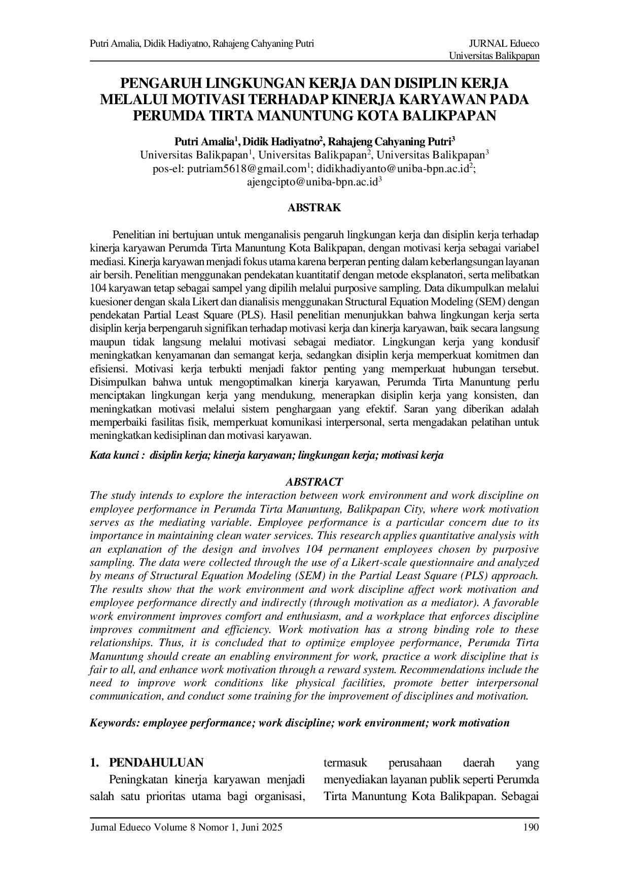 Jurnal EduecoJurnal EduecoPenelitian ini bertujuan untuk menganalisis pengaruh lingkungan kerja dan disiplin kerja terhadap kinerja karyawan Perumda Tirta Manuntung Kota Balikpapan, dengan motivasi kerja sebagai variabel mediasi. Kinerja karyawan menjadi fokus utama karena berperan penting dalam keberlangsungan layanan air bersih. Penelitian menggunakan pendekatan kuantitatif dengan metode eksplanatori, serta melibatkan 104 karyawan tetap sebagai sampel yang dipilih melalui purposive sampling. Data dikumpulkan melalui kuesioner dengan skala Likert dan dianalisis menggunakan Structural Equation Modeling (SEM) dengan pendekatan Partial Least Square (PLS). Hasil penelitian menunjukkan bahwa lingkungan kerja serta disiplin kerja berpengaruh signifikan terhadap motivasi kerja dan kinerja karyawan, baik secara langsung maupun tidak langsung melalui motivasi sebagai mediator. Lingkungan kerja yang kondusif meningkatkan kenyamanan dan semangat kerja, sedangkan disiplin kerja memperkuat komitmen dan efisiensi. Motivasi kerja terbukti menjadi faktor penting yang memperkuat hubungan tersebut. Disimpulkan bahwa untuk mengoptimalkan kinerja karyawan, Perumda Tirta Manuntung perlu menciptakan lingkungan kerja yang mendukung, menerapkan disiplin kerja yang konsisten, dan meningkatkan motivasi melalui sistem penghargaan yang efektif. Saran yang diberikan adalah memperbaiki fasilitas fisik, memperkuat komunikasi interpersonal, serta mengadakan pelatihan untuk meningkatkan kedisiplinan dan motivasi karyawan.
