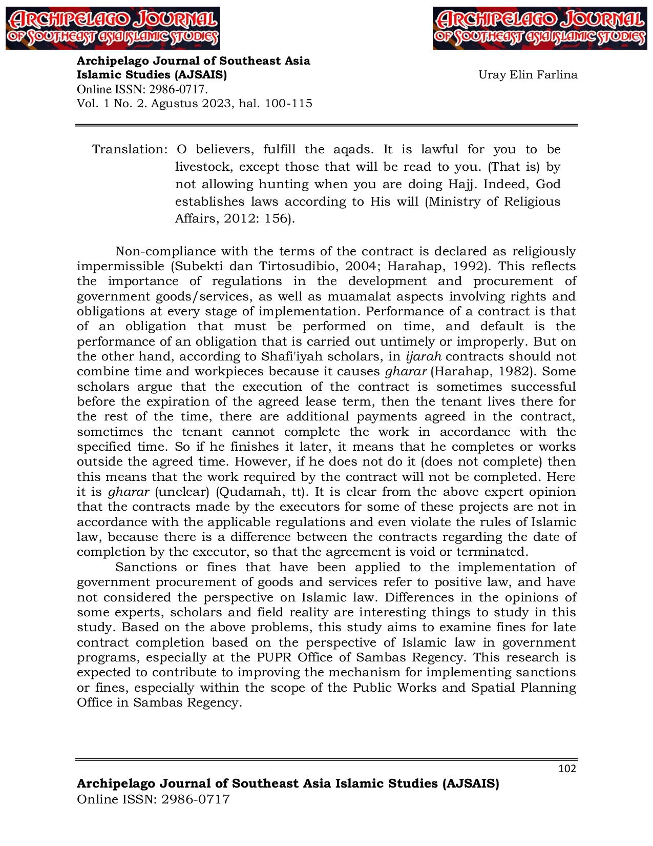 Archipelago Journal of Southeast Asia Islamic StudiesArchipelago Journal of Southeast Asia Islamic StudiesPengadaan barang dan jasa pemerintah melibatkan hak dan kewajiban bagi semua pihak yang terlibat, termasuk entitas pemerintah, kontraktor individu, dan organisasi. Dalam Dinas Pekerjaan Umum dan Penataan Ruang (PUPR) Kabupaten Sambas, keterlambatan pelaksanaan kontrak sering terjadi, sehingga menyebabkan penerapan denda terhadap para kontraktor. Menurut hukum Islam, disarankan agar perjanjian sewa menyatakan secara eksplisit durasi serta kompensasi pada awal kontrak, bukan setelah pekerjaan dimulai. Penelitian ini bertujuan dua hal: (1) meneliti penerapan denda atas keterlambatan kontrak di PUPR Kabupaten Sambas, dan (2) menilai kesesuaian denda tersebut dengan hukum Islam. Metodenya adalah penelitian lapangan dengan analisis deskriptif. Hasil menunjukkan bahwa PUPR Kabupaten Sambas melakukan investigasi, penilaian, dan survei sebelum menegakkan denda sesuai Peraturan Presiden No. 16 Tahun 2018, Art. 79, § 4; namun denda tidak sepenuhnya sesuai hukum Islam, terutama karena adanya perbedaan antara waktu yang disepakati dan pelaksanaan aktual, yang dapat membuat kontrak tidak sah.