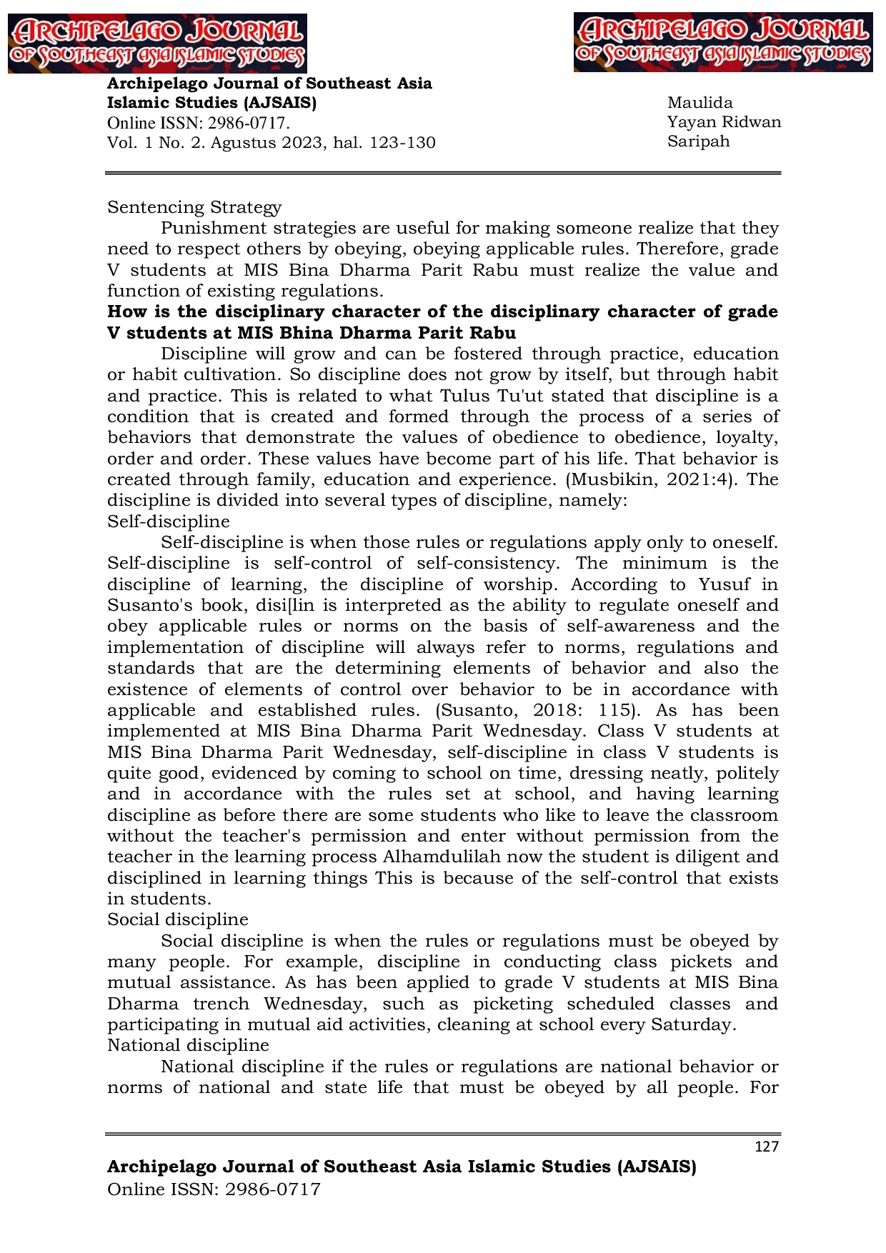 Archipelago Journal of Southeast Asia Islamic StudiesArchipelago Journal of Southeast Asia Islamic StudiesTesis ini membahas Strategi Guru dalam Menentukan Karakter Disiplin Siswa Kelas V di MIS Bina Dharma Parit Rabu. Penelitian ini memiliki tiga tujuan penelitian, yaitu: Pertama, mengetahui bagaimana strategi guru dalam membentuk karakter disiplin siswa kelas V di MIS Bina Dharma Parit Rabu Kecamatan Teluk Keramat. Kedua, mengetahui bagaimana karakter disiplin siswa kelas V di MIS Bina Dharma Parit Rabu Kecamatan Teluk Keramat. Ketiga, mengetahui apa saja faktor pendukung dan penghambat dalam membentuk karakter disiplin siswa kelas V di MIS Bina Dharma Parit Rabu Kecamatan Teluk Keramat. Penelitian ini menggunakan pendekatan kualitatif dengan jenis penelitian fenomenologis. Ada tiga teknik pengumpulan data dalam penelitian ini, yaitu: Wawancara, Observasi, dan Dokumentasi. Sedangkan teknik analisis data yang digunakan adalah pengumpulan data, reduksi data, tampilan data, pengambilan kesimpulan, dan verifikasi. Kemudian teknik pemeriksaan validitas data yang digunakan adalah triangulasi (triangulasi sumber) dan member check. Hasil penelitian adalah: Pertama, strategi guru dalam membentuk karakter disiplin siswa di MIS Bina Dharma Parit Rabu Kecamatan Teluk Keramat pada tahun ajaran 2022-2023 menggunakan beberapa strategi, yaitu strategi habituasi, strategi teladan, strategi pengawasan, dan strategi hukuman. Kedua, karakter disiplin siswa kelas V di MIS Bina Dharma Parit Rabu Kecamatan Teluk Keramat pada tahun ajaran 2022-2023 terdiri dari beberapa jenis disiplin, yaitu disiplin diri, disiplin sosial, dan disiplin nasional. Ketiga, faktor pendukung dan penghambat dalam membentuk karakter disiplin siswa kelas V di MIS Bina Dharma Parit Rabu Kecamatan Teluk Keramat pada tahun ajaran 2022-2023 adalah perubahan yang timbul Menghasilkan atau menyebabkan perubahan atau pertumbuhan, menjaga hubungan yang dekat antara guru dan siswa, dan adanya komunikasi yang baik antara orang tua, guru, dan siswa serta lingkungan masyarakat dan contoh dari guru, orang tua, dan masyarakat. Sedangkan faktor penghambat adalah kurangnya minat anak dan lingkungan keluarga.