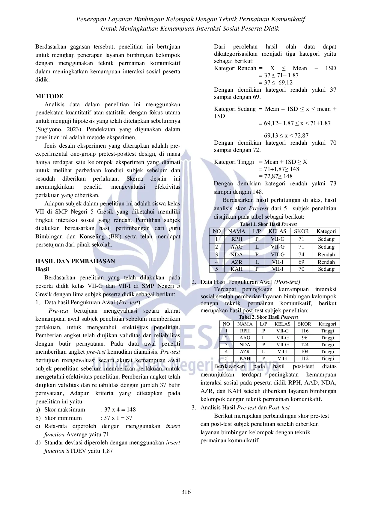 Berdasarkan hasil penelitian yang dilaksanakan di SMP Negeri 5 Gresik terhadap lima orang peserta didik, dapat disimpulkan bahwa layanan bimbingan kelompok dengan teknik permainan komunikatif efektif dalam meningkatkan kemampuan interaksi sosial.Seluruh peserta didik yang sebelumnya berada pada kategori sedang dan rendah mengalami peningkatan hingga mencapai kategori tinggi setelah mengikuti layanan.Terdapat peningkatan signifikan pada rata-rata skor kemampuan interaksi sosial dan hasil uji statistik menunjukkan perbedaan bermakna antara skor sebelum dan sesudah perlakuan, sehingga hipotesis alternatif diterima.