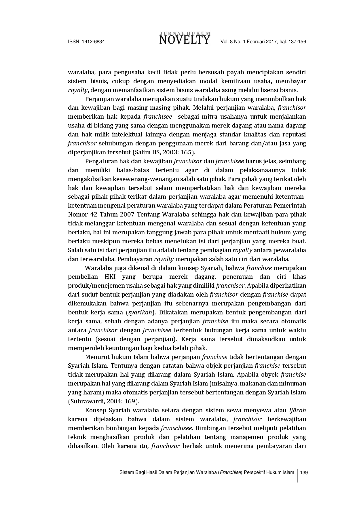 http://journal.uad.ac.id/index.php/Noveltyhttp://journal.uad.ac.id/index.php/NoveltyFranchise (waralaba) merupakan sebuah model bisnis yang telah terbukti berhasil dan banyak pengusaha menggunakan model bisnis tersebut saat ini. Dalam hukum ekonomi Islam, Waralaba masih dianggap suatu hal baru. Meskipun demikian, hal tersebut tidak menyurutkan para pengusaha untuk menekuninya karena waralaba lebih menguntungkan dan tidak bertentangan dengan konsep Syariah. Salah satu ciri khas waralaba adalah adanya royalty, yaitu pembagian keuntungan antar franchisor dan franchisee dengan ketentuan yang telah disepakati oleh kedua belah pihak. Adapun dalam waralaba Syariah, sistem pembagian keuntungannya menggunakan sistem bagi hasil. Permasalahan yang akan dikaji dalam penelitian ini adalah bagaimana sistem bagi hasil dalam perjanjian waralaba perspektif hukum Islam, dan bagaimana cara mengatasi kendala dalam sistem bagi hasil dalam perjanjian waralaba perspektif hukum Islam. Metode yang digunakan dalam penelitian ini yaitu menggunakan metode pendekatan yuridis normatif, dan menggunakan spesifikasi penelitian deskriptif analitis. Adapun penarikan sampelnya menggunakan purposive sampling. Alat penelitian meliputi studi kepustakaan dan wawancara. Selanjutnya dianalisis dengan metode kualitatif. Hasil penelitian menunjukkan pembagian keuntungan dalam perjanjian waralaba perspektif hukum Islam menggunakan sistem bagi hasil, dengan persentase yang bervariatif yaitu: 50:50 atau 60:40 tergantung kesepakatan para pihak (franchisor dan franchisee). Kendala yang sering terjadi dalam perjanjian waralaba, yaitu ketika terjadi kerugian, ketidakseimbangan antara prestasi yang diberikan dengan keuntungan (bagi hasil), dan adanya pembagian keuntungan yang kurang transparan. Penyelesaian kendala-kendala tersebut terutama dalam pembagian keuntungan biasanya diselesaikan secara musyawarah mufakat, pembayaran ganti rugi, atau jika tidak tercapai dapat melalui arbitrase.