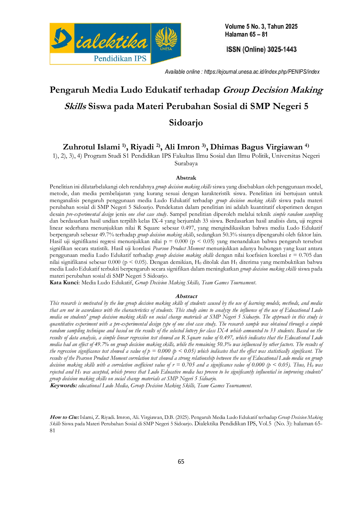 Jurnal Dialektika Pendidikan IPSJurnal Dialektika Pendidikan IPSPenelitian ini dilatarbelakangi oleh rendahnya group decision making skills siswa yang disebabkan oleh penggunaan model, metode, dan media pembelajaran yang kurang sesuai dengan karakteristik siswa. Penelitian ini bertujuan untuk menganalisis pengaruh penggunaan media Ludo Edukatif terhadap group decision making skills siswa pada materi perubahan sosial di SMP Negeri 5 Sidoarjo. Pendekatan dalam penelitian ini adalah kuantitatif eksperimen dengan desain pre-experimental design jenis one shot case study. Sampel penelitian diperoleh melalui teknik simple random sampling dan berdasarkan hasil undian terpilih kelas IX-4 yang berjumlah 33 siswa. Berdasarkan hasil analisis data, uji regresi linear sederhana menunjukkan nilai R Square sebesar 0.497, yang mengindikasikan bahwa media Ludo Edukatif berpengaruh sebesar 49.7% terhadap group decision making skills, sedangkan 50.3% sisanya dipengaruhi oleh faktor lain. Hasil uji signifikansi regresi menunjukkan nilai p = 0.000 (p < 0.05) yang menandakan bahwa pengaruh tersebut signifikan secara statistik. Hasil uji korelasi Pearson Product Moment menunjukkan adanya hubungan yang kuat antara penggunaan media Ludo Edukatif terhadap group decision making skills dengan nilai koefisien korelasi r = 0.705 dan nilai signifikansi sebesar 0.000 (p < 0.05). Dengan demikian, H0 ditolak dan H1 diterima yang membuktikan bahwa media Ludo Edukatif terbukti berpengaruh secara signifikan dalam meningkatkan group decision making skills siswa pada materi perubahan sosial di SMP Negeri 5 Sidoarjo.