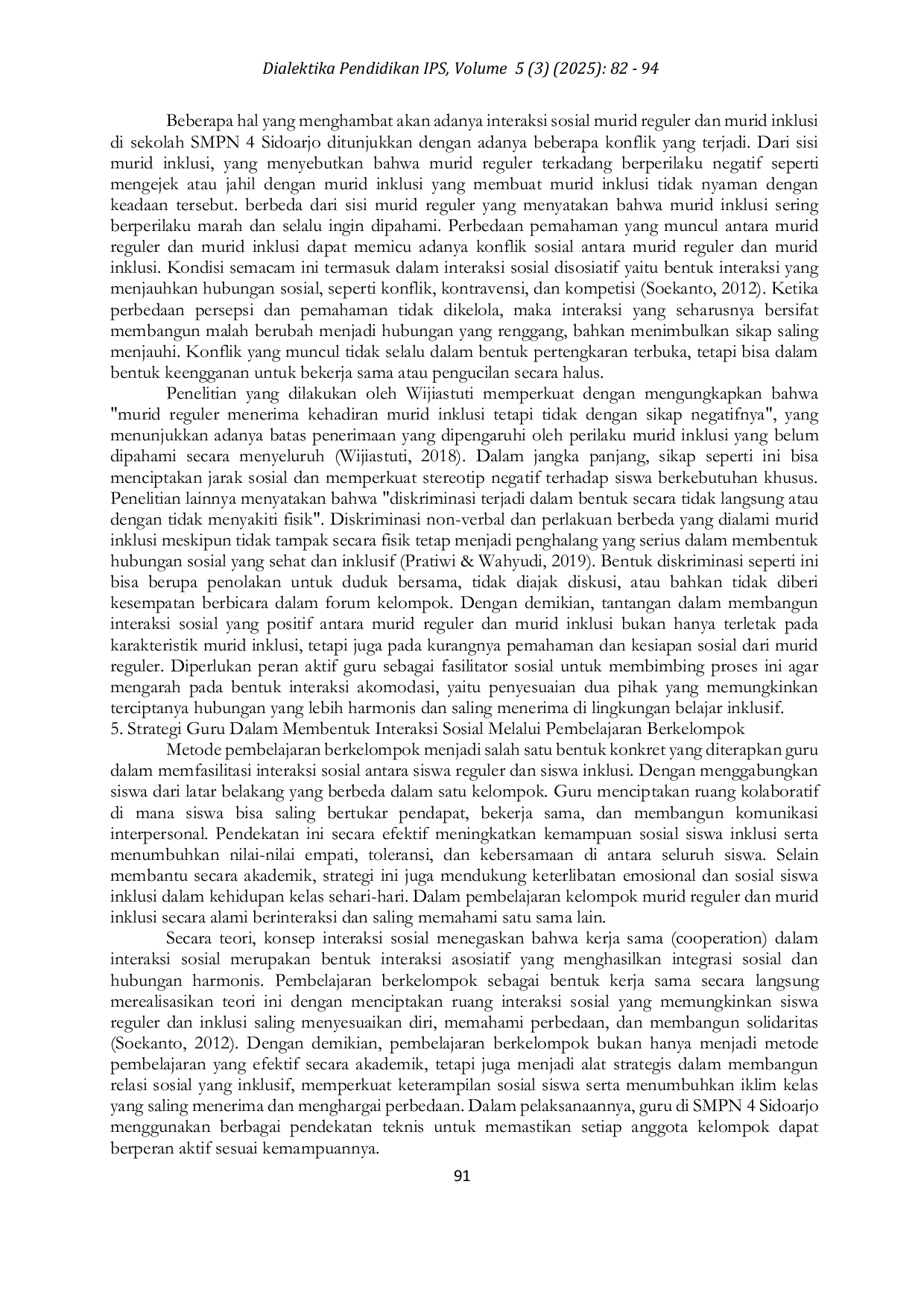 Jurnal Dialektika Pendidikan IPSJurnal Dialektika Pendidikan IPSPenelitian ini bertujuan untuk mendeskripsikan bentuk interaksi sosial antara murid inklusi dan murid reguler di kelas VII SMPN 4 Sidoarjo serta mengidentifikasi peran guru dan hambatan yang dihadapi dalam proses tersebut. Penelitian ini menggunakan pendekatan kualitatif dengan metode studi kasus. Hasil penelitian menunjukkan bahwa interaksi sosial antara murid reguler dan murid inklusi berlangsung secara bertahap dan bersifat dinamis. Bentuk interaksi yang terjalin meliputi kerja sama dalam pembelajaran, solidaritas sosial, serta tumbuhnya penerimaan sosial dan empati. Program Sobat Inklusi menjadi salah satu sarana efektif dalam mendorong interaksi yang suportif dan setara. Guru berperan sebagai fasilitator, mediator konflik, serta pemberi pemahaman sosial yang membantu menciptakan iklim kelas inklusif. Namun demikian, ditemukan tantangan seperti ketakutan atau kecanggungan murid reguler dalam menghadapi perilaku emosional murid inklusi yang sulit diprediksi.