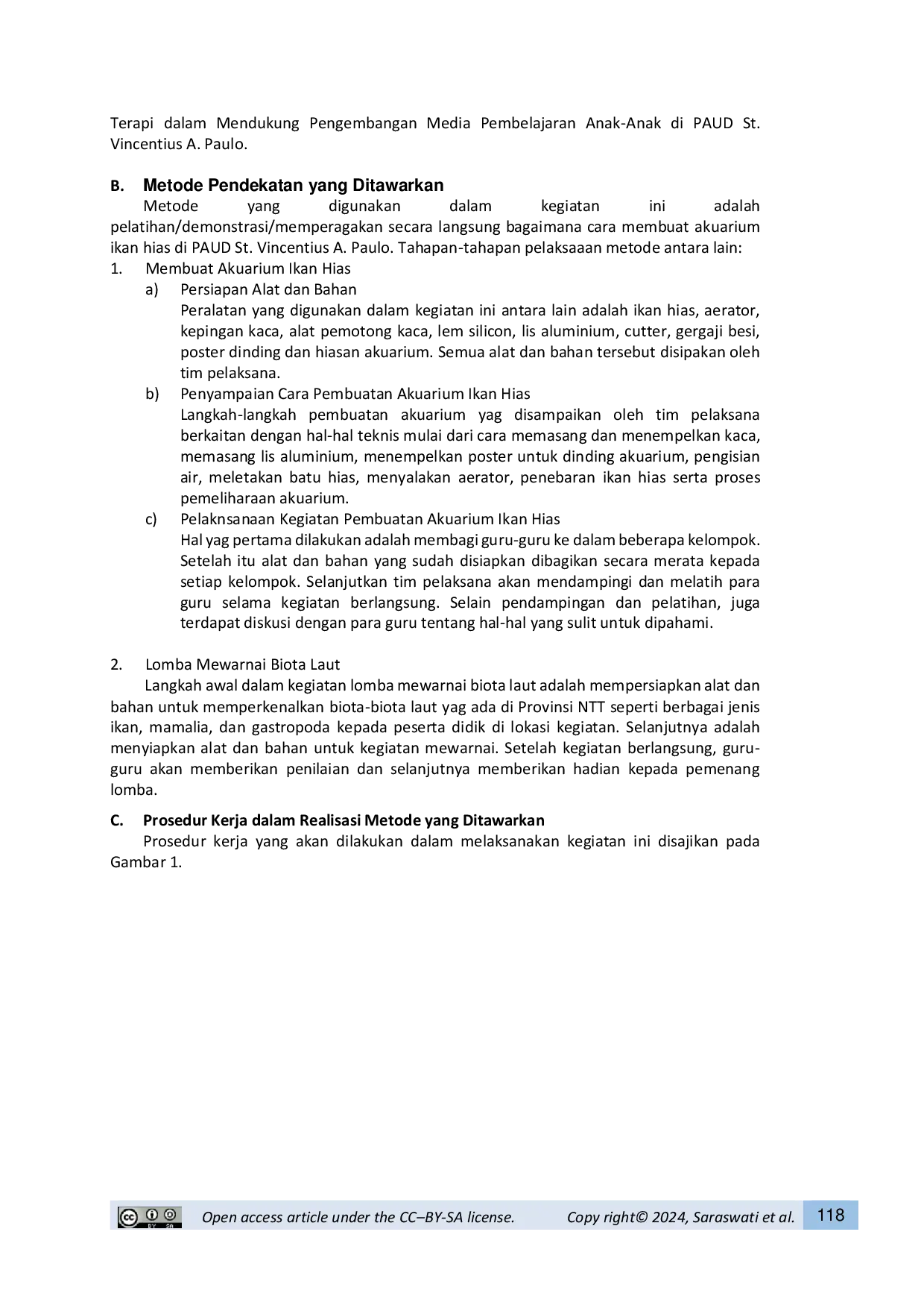 Indonesian Journal of Fisheries Community Empowerment (Jurnal Pengabdian Perikanan Indonesia)Indonesian Journal of Fisheries Community Empowerment (Jurnal Pengabdian Perikanan Indonesia)Pendidikan anak usia dini memerlukan media pembelajaran yang menarik agar anak dapat belajar secara aktif. Kegiatan ini ditujukan untuk membantu guru PAUD St. Vincentius A. Paulo di Kota Kupang meningkatkan keterampilan dalam membuat akuarium ikan hias serta mengadakan lomba mewarnai biota laut. Metode yang digunakan adalah pelatihan demonstrasi langsung dan lomba mewarnai yang melibatkan guru dan siswa. Hasilnya diharapkan dapat meningkatkan kualitas dan keberlanjutan media pembelajaran di sekolah tersebut serta mengedukasi siswa tentang lingkungan laut.