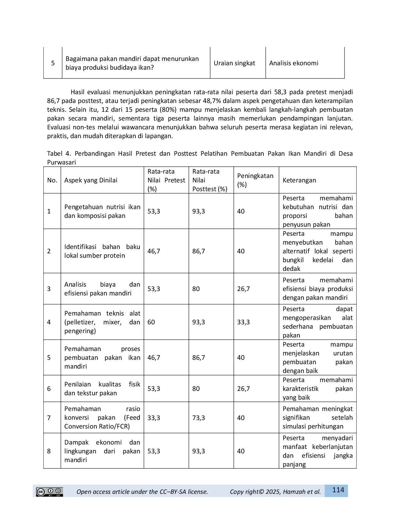Kegiatan pengabdian masyarakat berhasil meningkatkan pengetahuan dan keterampilan pembudidaya ikan dalam memproduksi pakan mandiri berbasis bahan baku lokal.Evaluasi pre‑test dan post‑test menunjukkan peningkatan rata‑rata sebesar 38,1 %, terutama pada pemahaman teknis dan kelembagaan.Peserta berkomitmen melanjutkan produksi pakan mandiri secara berkelompok, memperkuat kemandirian ekonomi dan mendukung kebijakan kemandirian pakan nasional.