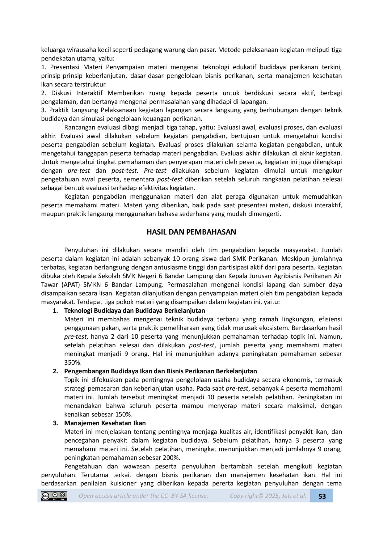 UNRAMUNRAM Peningkatan pemahaman peserta sebanyak 72% untuk materi cara budidaya ikan yang baik, 83% pada materi manajemen pembenihan ikan, pengelolaan induk, danPeningkatan pemahaman peserta sebanyak 72% untuk materi cara budidaya ikan yang baik, 83% pada materi manajemen pembenihan ikan, pengelolaan induk, dan
