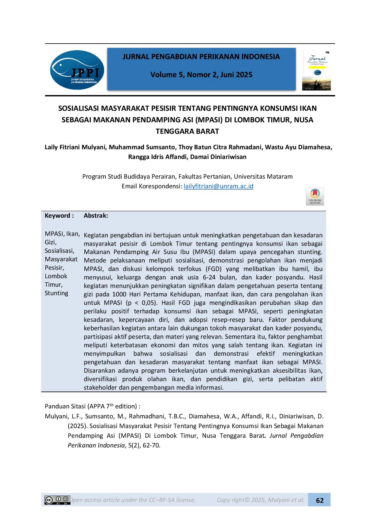 Indonesian Journal of Fisheries Community Empowerment (Jurnal Pengabdian Perikanan Indonesia)Indonesian Journal of Fisheries Community Empowerment (Jurnal Pengabdian Perikanan Indonesia)Kegiatan pengabdian ini bertujuan untuk meningkatkan pengetahuan dan kesadaran masyarakat pesisir di Lombok Timur tentang pentingnya konsumsi ikan sebagai Makanan Pendamping Air Susu Ibu (MPASI) dalam upaya pencegahan stunting. Hasil kegiatan menunjukkan peningkatan signifikan dalam pengetahuan peserta tentang gizi pada 1000 Hari Pertama Kehidupan, manfaat ikan, dan cara pengolahan ikan untuk MPASI. Faktor pendukung keberhasilan antara lain dukungan tokoh masyarakat dan kader posyandu, partisipasi aktif peserta, dan materi yang relevan. Sementara itu, faktor penghambat meliputi keterbatasan ekonomi dan mitos yang salah tentang ikan.
