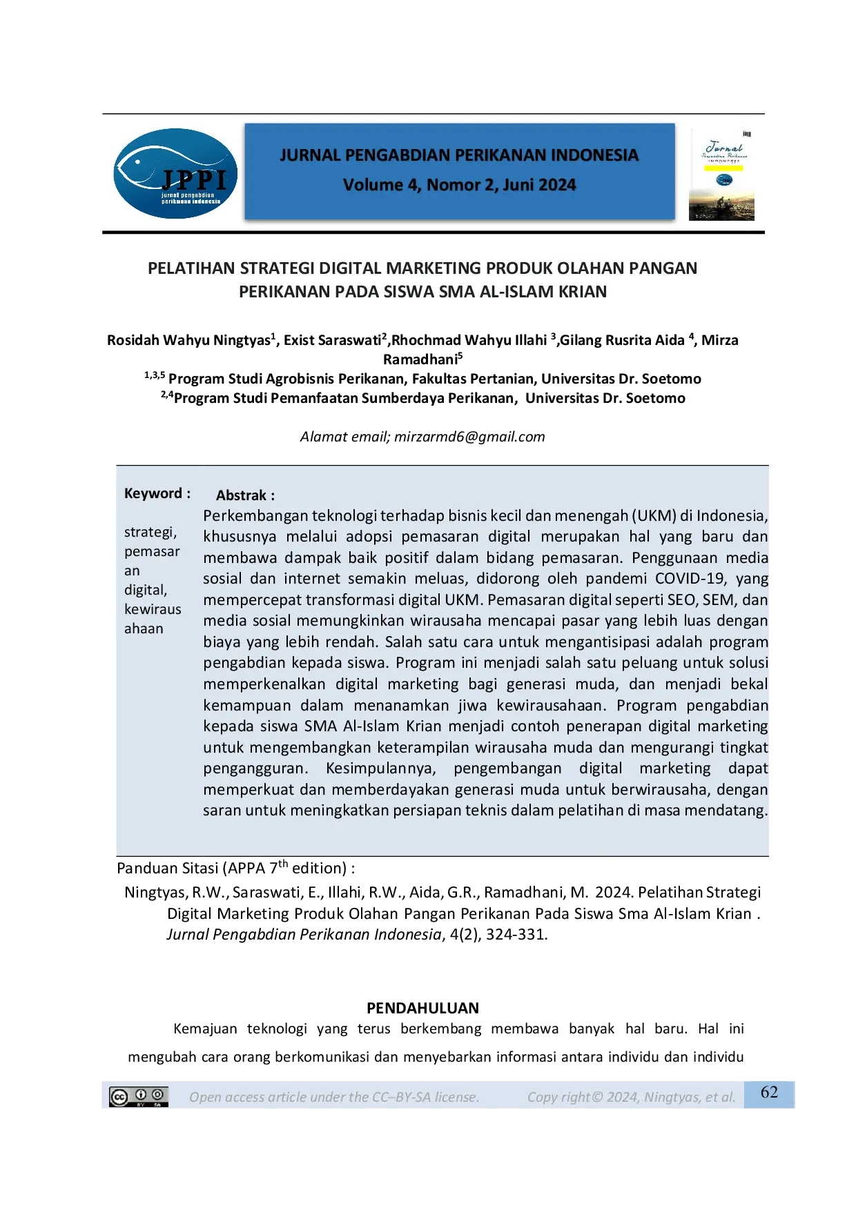 Indonesian Journal of Fisheries Community Empowerment (Jurnal Pengabdian Perikanan Indonesia)Indonesian Journal of Fisheries Community Empowerment (Jurnal Pengabdian Perikanan Indonesia)Perkembangan teknologi terhadap bisnis kecil dan menengah (UKM) di Indonesia, khususnya melalui adopsi pemasaran digital merupakan hal yang baru dan membawa dampak baik positif dalam bidang pemasaran. Penggunaan media sosial dan internet semakin meluas, didorong oleh pandemi COVID-19, yang mempercepat transformasi digital UKM. Pemasaran digital seperti SEO, SEM, dan media sosial memungkinkan wirausaha mencapai pasar yang lebih luas dengan biaya yang lebih rendah. Salah satu cara untuk mengantisipasi adalah program pengabdian kepada siswa. Program ini menjadi salah satu peluang untuk solusi memperkenalkan digital marketing bagi generasi muda, dan menjadi bekal kemampuan dalam menanamkan jiwa kewirausahaan. Program pengabdian kepada siswa SMA Al-Islam Krian menjadi contoh penerapan digital marketing untuk mengembangkan keterampilan wirausaha muda dan mengurangi tingkat pengangguran. Kesimpulannya, pengembangan digital marketing dapat memperkuat dan memberdayakan generasi muda untuk berwirausaha, dengan saran untuk meningkatkan persiapan teknis dalam pelatihan di masa mendatang.