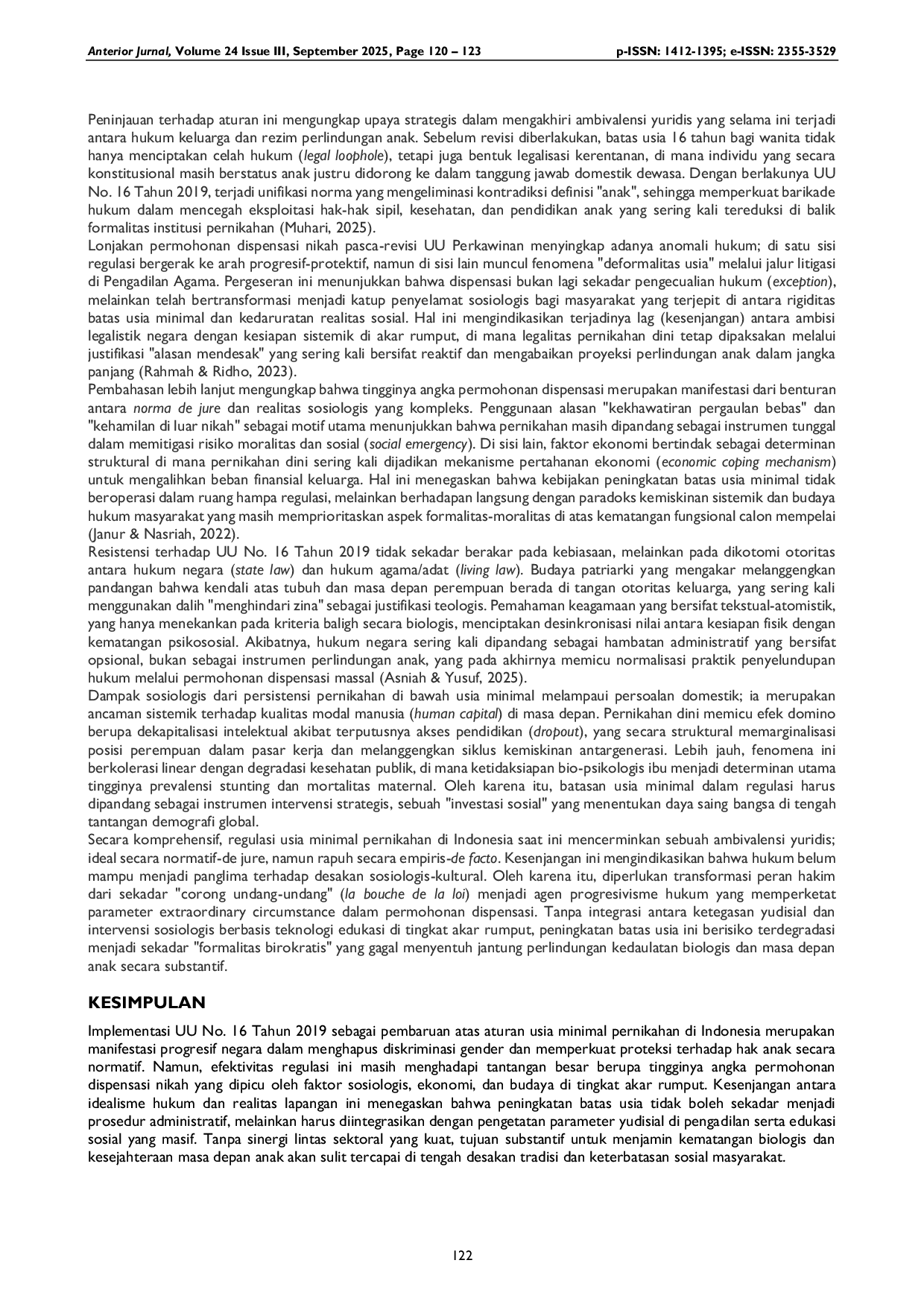 Anterior JurnalAnterior JurnalDinamika aturan batasan usia minimal pernikahan di Indonesia mengalami perubahan signifikan pasca diberlakukannya Undang-Undang Nomor 16 Tahun 2019 sebagai perubahan atas UU Nomor 1 Tahun 1974. Perubahan ini bertujuan untuk menekan angka pernikahan dini dan menyelaraskan dengan perlindungan hak anak. Artikel ini bertujuan untuk meninjau efektivitas regulasi batas usia minimal 19 tahun bagi pria dan wanita serta menganalisis implikasi hukum dan sosiologisnya di masyarakat. Penelitian ini menggunakan metode normatif-yuridis dengan pendekatan perundang-undangan (statute approach). Hasil tinjauan menunjukkan bahwa meskipun regulasi telah diperketat, tantangan besar masih ditemukan pada tingginya angka permohonan dispensasi nikah di Pengadilan Agama. Faktor budaya, ekonomi, dan pemahaman agama menjadi variabel penghambat implementasi undang-undang secara maksimal. Oleh karena itu, diperlukan sinkronisasi antara kebijakan hukum dengan edukasi sosial yang masif untuk memastikan tujuan utama dari peningkatan batas usia pernikahan dapat tercapai secara substantif.