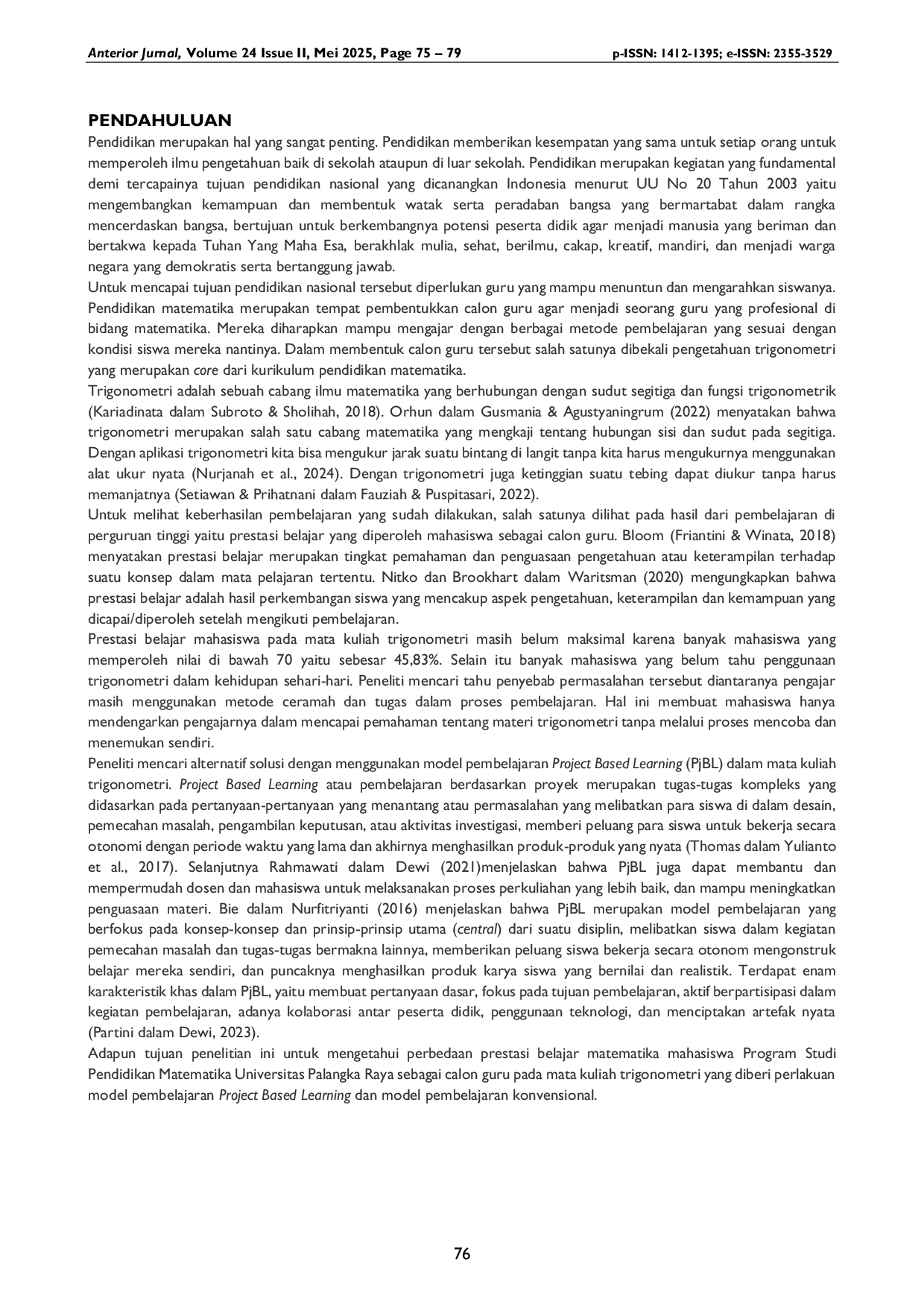 Penelitian selanjutnya dapat dilakukan dengan membandingkan efektivitas model pembelajaran Project Based Learning dengan model pembelajaran inovatif lainnya, seperti blended learning atau flipped classroom, untuk mengidentifikasi pendekatan yang paling optimal dalam meningkatkan prestasi belajar trigonometri. Selain itu, perlu dilakukan penelitian lebih lanjut untuk menggali faktor-faktor lain yang dapat mempengaruhi efektivitas model pembelajaran Project Based Learning, seperti gaya belajar mahasiswa, tingkat motivasi, dan kemampuan kolaborasi. Terakhir, penelitian dapat difokuskan pada pengembangan instrumen penilaian yang lebih komprehensif dan valid untuk mengukur prestasi belajar trigonometri, tidak hanya dari segi kognitif tetapi juga dari segi keterampilan pemecahan masalah dan aplikasi konsep dalam kehidupan sehari-hari, sehingga dapat memberikan gambaran yang lebih utuh tentang kemampuan mahasiswa sebagai calon guru matematika.