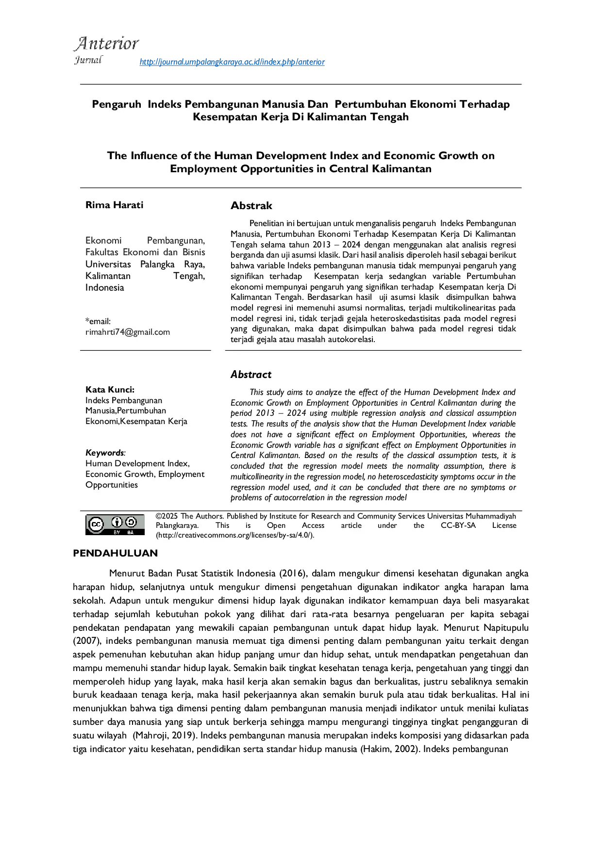 Anterior JurnalAnterior JurnalPenelitian ini bertujuan untuk menganalisis pengaruh Indeks Pembangunan Manusia, Pertumbuhan Ekonomi Terhadap Kesempatan Kerja Di Kalimantan Tengah selama tahun 2013 – 2024 dengan menggunakan alat analisis regresi berganda dan uji asumsi klasik. Dari hasil analisis diperoleh hasil sebagai berikut bahwa variable Indeks pembangunan manusia tidak mempunyai pengaruh yang signifikan terhadap Kesempatan kerja sedangkan variable Pertumbuhan ekonomi mempunyai pengaruh yang signifikan terhadap Kesempatan kerja Di Kalimantan Tengah. Berdasarkan hasil uji asumsi klasik disimpulkan bahwa model regresi ini memenuhi asumsi normalitas, terjadi multikolinearitas pada model regresi ini, tidak terjadi gejala heteroskedastisitas pada model regresi yang digunakan, maka dapat disimpulkan bahwa pada model regresi tidak terjadi gejala atau masalah autokorelasi.