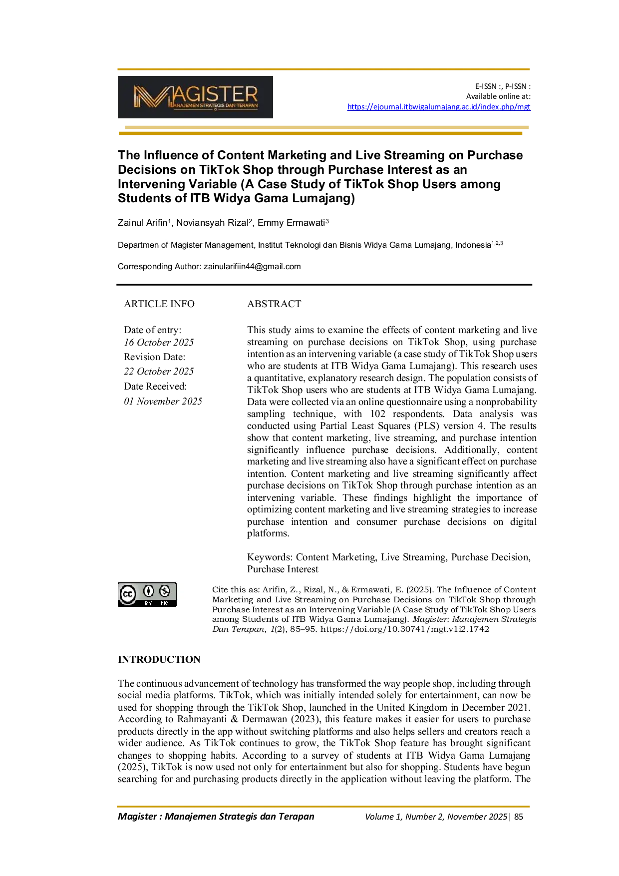 - The Influence of Content Marketing and Live Streaming on Purchase Decisions on TikTok Shop through Purchase... doi.org/10.30741/mgt.v1i2.1742The Influence of Content Marketing and Live Streaming on Purchase Decisions on TikTok Shop through Purchase doi 10 30741 mgt v1i2 1742