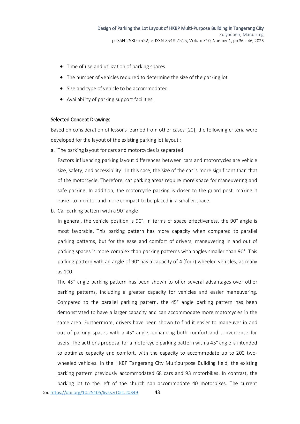 International Journal on Livable SpaceInternational Journal on Livable SpaceLahan parkir HKBP Tangerang Kota memiliki peran penting dalam memenuhi kebutuhan parkir jemaat yang ingin beribadah di gereja tersebut. Lahan parkir terletak di sekitar bangunan multi-fungsi HKBP Tangerang Kota yang masih beroperasi, namun kapasitas parkir tidak mampu menampung jumlah kendaraan yang dibutuhkan. Tujuan penelitian ini adalah meninjau desain tata letak lahan parkir untuk mengoptimalkan jumlah kendaraan yang dapat diparkir. Metodologi penelitian menggunakan metode observasi yang dilakukan oleh beberapa surveyan lapangan, dengan data primer dan sekunder diperoleh dari referensi dan studi sebelumnya. Hasil menunjukkan bahwa manajemen lahan parkir yang efektif memerlukan pola parkir optimal dan alur lalu lintas yang baik. Simulasi menunjukkan bahwa pola parkir dengan sudut 45° dapat menampung 200 sepeda motor, sedangkan pola 90° dapat menampung 100 mobil.
