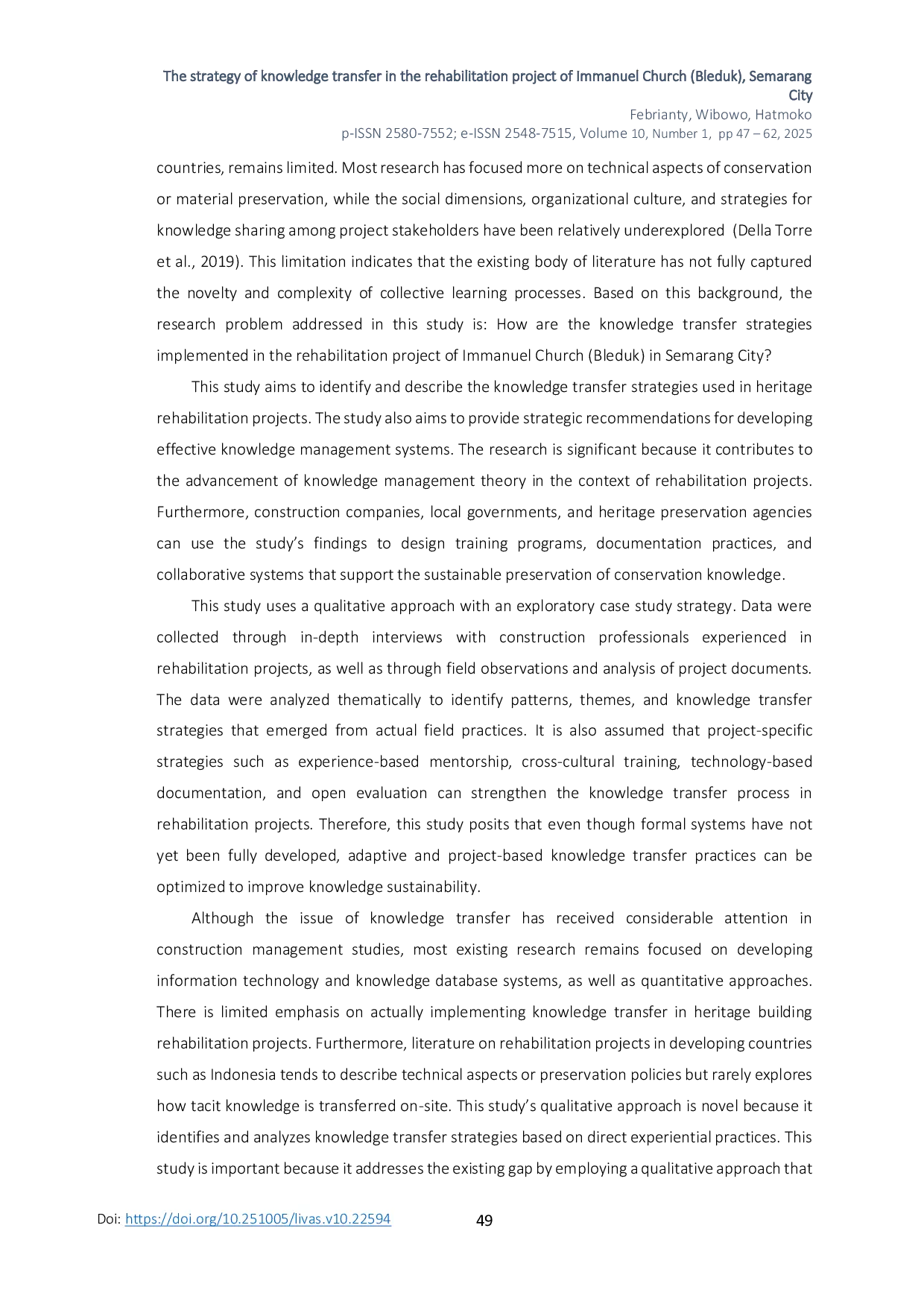 International Journal on Livable SpaceInternational Journal on Livable SpaceTransfer pengetahuan memainkan peran vital dalam menjaga kualitas proyek konstruksi, terutama dalam rehabilitasi bangunan bersejarah, yang menuntut keahlian kontekstual dan pemahaman mendalam tentang nilai-nilai sejarah. Tujuan penelitian ini adalah untuk mengeksplorasi dan menganalisis implementasi strategi transfer pengetahuan oleh perusahaan konstruksi dalam proyek konservasi bangunan bersejarah. Pendekatan kualitatif digunakan, dengan data dikumpulkan melalui wawancara mendalam, observasi lapangan, dan analisis dokumen proyek terpilih. Temuan menunjukkan bahwa transfer pengetahuan dalam proyek ini sebagian besar bersifat informal dan bergantung pada pengalaman individu, jaringan interpersonal, dan komunikasi lintas generasi. Pengetahuan taktis, termasuk teknik konservasi tradisional dan penilaian bahan yang menua, tetap tidak terdokumentasi dan tidak terintegrasi ke dalam sistem manajemen pengetahuan formal. Kesimpulan penelitian ini adalah identifikasi strategi efektif yang mencakup bimbingan berdasarkan pengalaman, kolaborasi lintas generasi, insentif tim, dan alat digital terdokumentasi. Studi ini merekomendasikan pengembangan sistem manajemen pengetahuan adaptif dan partisipatif untuk meningkatkan keberlanjutan praktik konservasi dan melestarikan nilai-nilai sejarah lintas generasi.