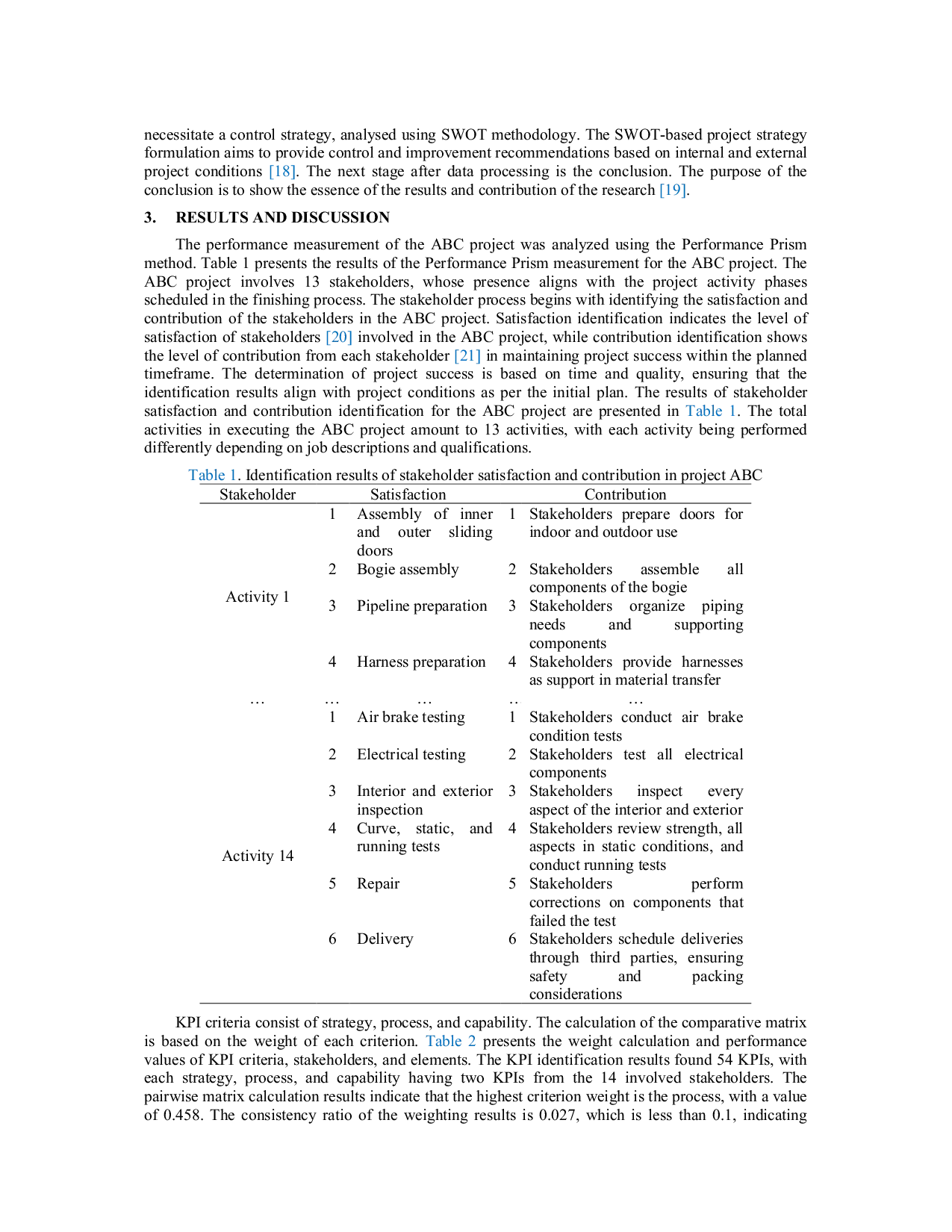 Analisis dan penilaian kinerja proyek ABC menunjukkan bahwa elemen proses merupakan kriteria utama dalam manajemennya.Aspek proses memiliki bobot 0,458, menjadikannya komponen paling penting dalam keberhasilan proyek ABC.Para pemangku kepentingan yang terlibat dalam aktivitas 14, yaitu fase inspeksi akhir, memberikan pengaruh signifikan terhadap kinerja keseluruhan proyek, dengan bobot terbesar dibandingkan pemangku kepentingan lainnya.Hal ini menegaskan pentingnya kontrol kualitas akhir untuk mencegah keluhan dan penundaan penyelesaian proyek.Metode Critical Success Factor (CSF) digunakan untuk menentukan faktor keberhasilan utama proyek, menghasilkan “monitoring dan evaluasi sebagai pengaruh paling signifikan terhadap kinerja proyek.Dengan memanfaatkan data tersebut, analisis SWOT dilakukan untuk mengembangkan 16 strategi perbaikan, yang dikategorikan menjadi empat kelompok.Teknik-teknik ini menekankan pemanfaatan teknologi, peningkatan komunikasi antar tim, dan penguatan sistem manajemen kualitas dan kontrol proses.Hasil penelitian ini menyoroti bahwa efektivitas manajemen proses dan kualitas pemantauan kinerja secara signifikan memengaruhi keberhasilan proyek.Oleh karena itu, pelaksanaan metode yang sesuai sangat penting untuk meningkatkan efisiensi, mengurangi kemungkinan penundaan, dan meningkatkan daya saing perusahaan dalam manajemen proyek di masa depan.Penelitian tambahan disarankan untuk menyelidiki hubungan antara kinerja proyek dan faktor keuangan guna meningkatkan efektivitas perencanaan keuangan proyek.