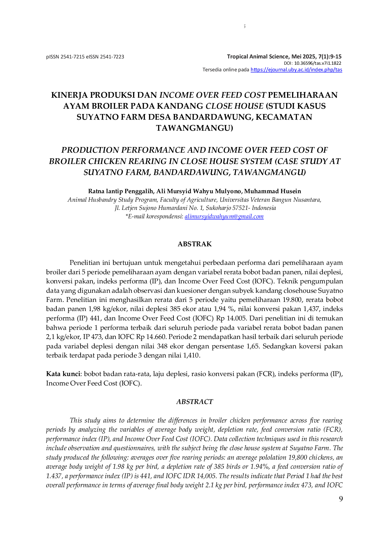 Tropical Animal ScienceTropical Animal SciencePenelitian ini bertujuan untuk mengetahui perbedaan performa dari pemeliharaan ayam broiler dari 5 periode pemeliharaan ayam dengan variabel rerata bobot badan panen, nilai deplesi, konversi pakan, indeks performa (IP), dan Income Over Feed Cost (IOFC). Teknik pengumpulan data yang digunakan adalah observasi dan kuesioner dengan subyek kandang closehouse Suyatno Farm. Penelitian ini menghasilkan rerata dari 5 periode yaitu pemeliharaan 19.800, rerata bobot badan panen 1,98 kg/ekor, nilai deplesi 385 ekor atau 1,94 %, nilai konversi pakan 1,437, indeks performa (IP) 441, dan Income Over Feed Cost (IOFC) Rp 14.005. Dari penelitian ini di temukan bahwa periode 1 performa terbaik dari seluruh periode pada variabel rerata bobot badan panen 2,1 kg/ekor, IP 473, dan IOFC Rp 14.660. Periode 2 mendapatkan hasil terbaik dari seluruh periode pada variabel deplesi dengan nilai 348 ekor dengan persentase 1,65. Sedangkan koversi pakan terbaik terdapat pada periode 3 dengan nilai 1,410.