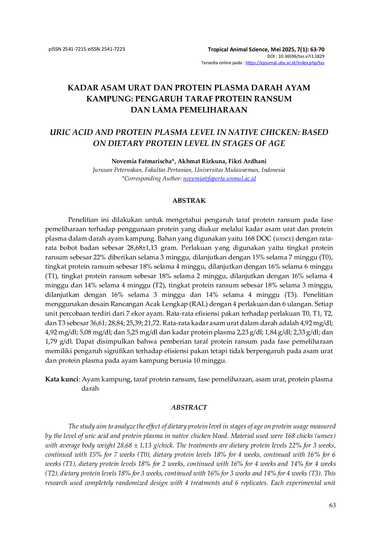 Tropical Animal ScienceTropical Animal SciencePenelitian ini dilakukan untuk mengetahui pengaruh taraf protein ransum pada fase pemeliharaan terhadap penggunaan protein yang diukur melalui kadar asam urat dan protein plasma dalam darah ayam kampung. Bahan yang digunakan yaitu 168 DOC (unsex) dengan rata-rata bobot badan sebesar 28,68±1,13 gram. Perlakuan yang digunakan yaitu tingkat protein ransum sebesar 22% diberikan selama 3 minggu, dilanjutkan dengan 15% selama 7 minggu (T0), tingkat protein ransum sebesar 18% selama 4 minggu, dilanjutkan dengan 16% selama 6 minggu (T1), tingkat protein ransum sebesar 18% selama 2 minggu, dilanjutkan dengan 16% selama 4 minggu dan 14% selama 4 minggu (T2), tingkat protein ransum sebesar 18% selama 3 minggu, dilanjutkan dengan 16% selama 3 minggu dan 14% selama 4 minggu (T3). Penelitian menggunakan desain Rancangan Acak Lengkap (RAL) dengan 4 perlakuan dan 6 ulangan. Setiap unit percobaan terdiri dari 7 ekor ayam. Rata-rata efisiensi pakan terhadap perlakuan T0, T1, T2, dan T3 sebesar 36,61; 28,84; 25,39; 21,72. Rata-rata kadar asam urat dalam darah adalah 4,92 mg/dl; 4,92 mg/dl; 5,08 mg/dl; dan 5,25 mg/dl dan kadar protein plasma 2,23 g/dl; 1,84 g/dl; 2,33 g/dl; dan 1,79 g/dl. Dapat disimpulkan bahwa pemberian taraf protein ransum pada fase pemeliharaan memiliki pengaruh signifikan terhadap efisiensi pakan tetapi tidak berpengaruh pada asam urat dan protein plasma pada ayam kampung berusia 10 minggu.