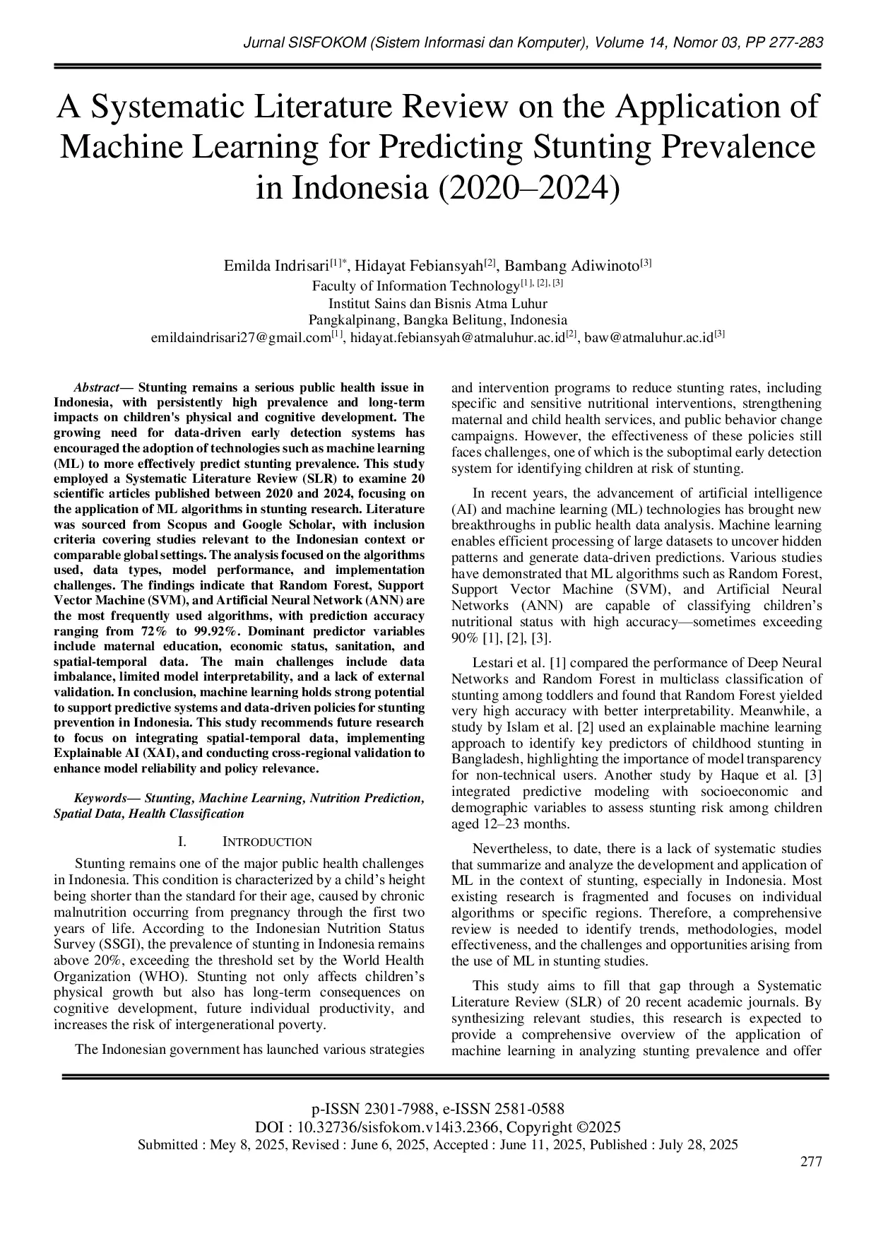 Jurnal Sisfokom (Sistem Informasi dan Komputer)Jurnal Sisfokom (Sistem Informasi dan Komputer)Stunting remains a serious public health issue in Indonesia, with persistently high prevalence and long-term impacts on childrens physical and cognitive development. The growing need for data-driven early detection systems has encouraged the adoption of technologies such as machine learning (ML) to more effectively predict stunting prevalence. This study employed a Systematic Literature Review (SLR) to examine 20 scientific articles published between 2020 and 2024, focusing on the application of ML algorithms in stunting research. The findings indicate that Random Forest, Support Vector Machine (SVM), and Artificial Neural Network (ANN) are the most frequently used algorithms, with prediction accuracy ranging from 72% to 99.92%. Dominant predictor variables include maternal education, economic status, sanitation, and spatial-temporal data. In conclusion, machine learning holds strong potential to support predictive systems and data-driven policies for stunting prevention in Indonesia. This study recommends future research to focus on integrating spatial-temporal data, implementing Explainable AI (XAI), and conducting cross-regional validation to enhance model reliability and policy relevance.