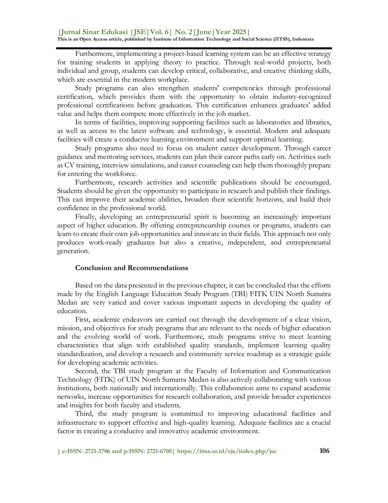 Berdasarkan data yang disajikan pada bab sebelumnya, dapat disimpulkan bahwa upaya yang dilakukan oleh Program Studi Pendidikan Bahasa Inggris (TBI) FITK UIN Sumatera Utara Medan sangat beragam dan mencakup berbagai aspek penting dalam pengembangan kualitas pendidikan.Pertama, upaya akademik dilakukan melalui pengembangan visi, misi, dan tujuan yang jelas untuk program studi yang relevan dengan kebutuhan pendidikan tinggi dan dunia kerja yang berkembang.Selain itu, program studi berusaha memenuhi karakteristik pembelajaran yang selaras dengan standar kualitas yang ditetapkan, menerapkan standar kualitas pembelajaran, dan mengembangkan peta jalan penelitian dan pengabdian masyarakat sebagai panduan strategis untuk mengembangkan aktivitas akademik.Kedua, program studi TBI di Fakultas Teknologi Informasi dan Komunikasi (FITK) UIN Sumatera Utara Medan juga aktif berkolaborasi dengan berbagai institusi, baik nasional maupun internasional.Kolaborasi ini bertujuan untuk memperluas jaringan akademik, meningkatkan peluang kolaborasi penelitian, dan memberikan pengalaman serta wawasan yang lebih luas bagi dosen dan mahasiswa.Ketiga, program studi berkomitmen untuk meningkatkan fasilitas dan infrastruktur pendidikan guna mendukung pembelajaran yang efektif dan berkualitas.Fasilitas yang memadai merupakan faktor krusial dalam menciptakan lingkungan akademik yang kondusif dan inovatif.Keempat, program studi juga terus berupaya meningkatkan kualitas dosen, baik dari segi tingkat pendidikan, posisi fungsional, maupun sertifikasi mengajar.Upaya ini dilakukan untuk memastikan bahwa staf pengajar memiliki kompetensi akademik dan profesional yang sesuai, sehingga dapat berkontribusi secara optimal dalam meningkatkan kualitas lulusan program studi.