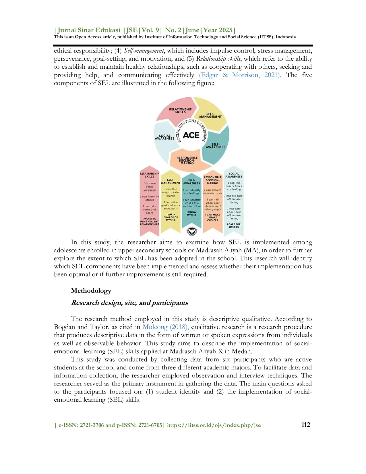 Jurnal Sinar EdukasiJurnal Sinar EdukasiFakta bahwa era yang kita alami saat ini merupakan era global dengan segala perubahannya membuat dunia pendidikan tidak bisa terlepas dari dinamika tersebut. Dengan perubahan zaman, siswa tidak hanya difokuskan pada penguasaan kompetensi utama dalam mata pelajaran, tetapi juga pada penguasaan berbagai keterampilan yang dibutuhkan di abad 21. Pendidik harus mampu menyesuaikan diri dengan perubahan yang beragam dan meningkatkan pengetahuan mereka mengenai berbagai isu global. Konsep pembelajaran sosial-emosional merupakan salah satu isu pendidikan yang saat ini banyak digaungkan. Metode penelitian yang digunakan dalam penelitian ini adalah kualitatif deskriptif. Penelitian ini bertujuan untuk mendeskripsikan penerapan keterampilan pembelajaran sosial-emosional di Madrasah Aliyah X Kota Medan. Berdasarkan temuan penelitian di atas, dapat disimpulkan bahwa siswa di Madrasah Aliyah X Kota Medan telah menerapkan pembelajaran sosial-emosional (SEL) secara parsial. Hal ini disebabkan oleh dukungan pendidik dan program sekolah yang mendorong pengembangan keterampilan di bidang SEL.