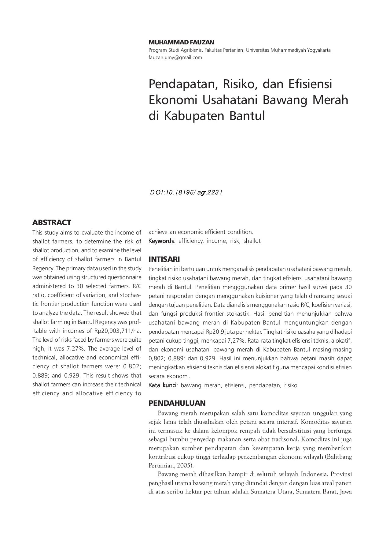 Usahatani bawang merah di Kabupaten Bantul menguntungkan dengan pendapatan sebesar Rp20.Tingkat risiko yang dihadapi petani cukup tinggi, yaitu sebesar 0,727 atau 72,7%.Rata-rata tingkat efisiensi teknis, alokatif, dan ekonomi usahatani bawang merah di Kabupaten Bantul masing-masing adalah 0,802.