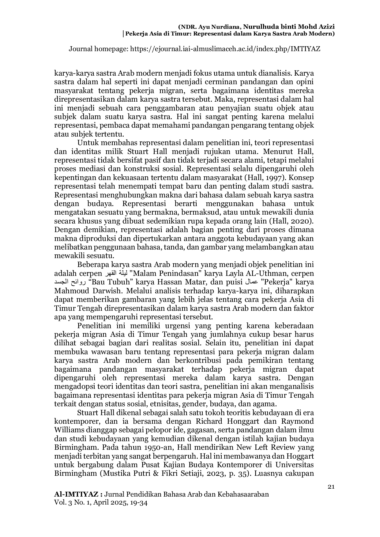 AL IMTIYAZ: Arabic Linguistics and International Methodology for the Tarbiyah of Arabic JournalAL IMTIYAZ: Arabic Linguistics and International Methodology for the Tarbiyah of Arabic JournalBerdasarkan data, setiap tahun puluhan ribu imigran Asia datang ke negara-negara Timur Tengah, terutama kawasan Teluk, untuk bekerja sebagai buruh maupun karyawan. Hal ini menimbulkan stigma terhadap pekerja Asia yang memiliki sisi positif dan negatif. Representasi tersebut dapat ditemukan dalam berbagai karya sastra Arab. Penelitian ini bertujuan untuk menganalisis representasi pekerja Asia di Timur Tengah dalam karya sastra Arab modern. Metode penelitian yang digunakan adalah kualitatif dengan pendekatan deskriptif-analitis. Data diperoleh dari tiga karya sastra Arab modern yang dipilih berdasarkan kelayakan dan relevansi terhadap topik penelitian. Teknik pengumpulan data dilakukan melalui studi literatur dan analisis data menggunakan analisis isi. Teori yang digunakan dalam penelitian ini adalah telaah identitas Stuart Hall sebagai kerangka teori. Teori identitas digunakan untuk menganalisis bagaimana pandangan sosial, budaya, agama, dan tradisi memengaruhi perspektif terhadap identitas pekerja Asia di Timur Tengah serta bagaimana hal tersebut direpresentasikan dalam karya sastra Arab modern. Hasil penelitian menunjukkan bahwa representasi pekerja Asia di Timur Tengah dalam karya sastra Arab modern mencakup berbagai aspek identitas, seperti migrasi, ekonomi, etnisitas, dan kelas sosial. Selain itu, terdapat pula perbedaan representasi antara pekerja laki-laki dan perempuan.