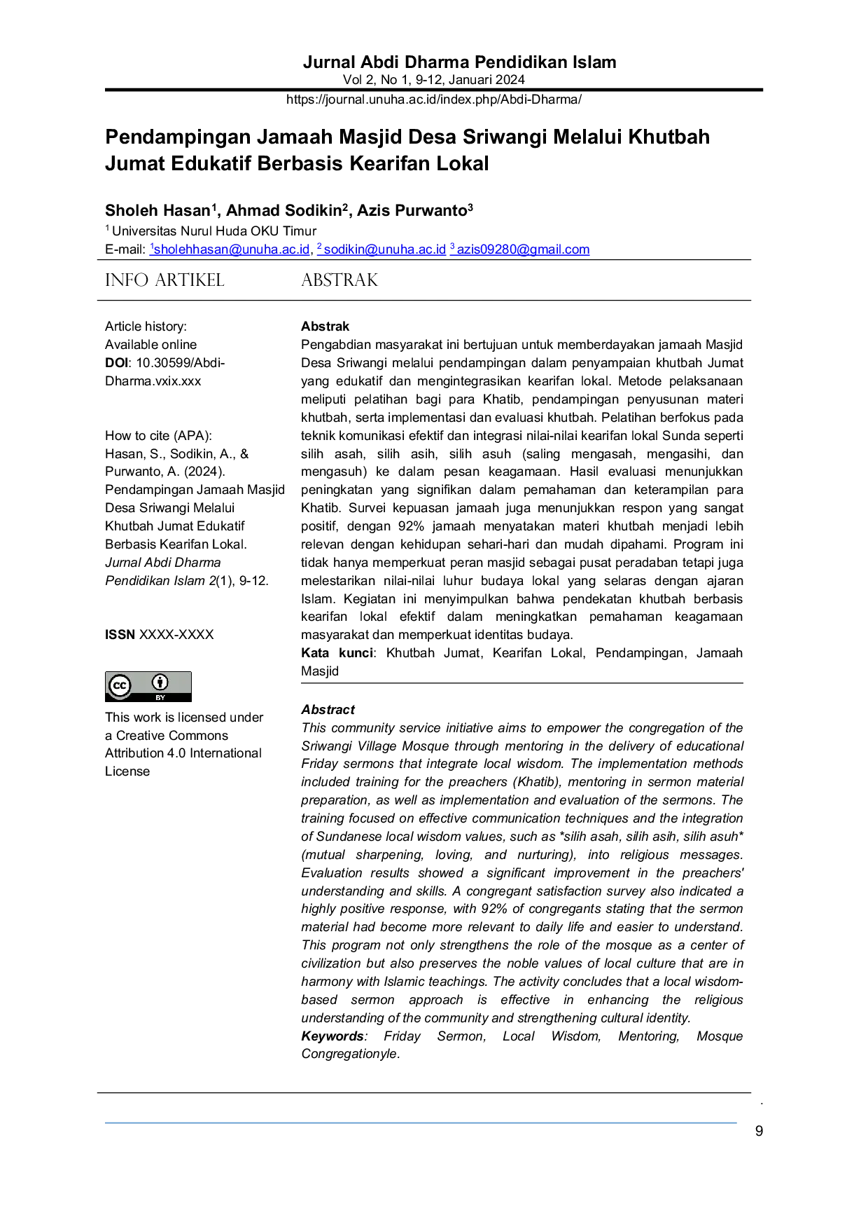 Jurnal Abdi DharmaJurnal Abdi DharmaPengabdian masyarakat ini bertujuan untuk memberdayakan jamaah Masjid Desa Sriwangi melalui pendampingan dalam penyampaian khutbah Jumat yang edukatif dan mengintegrasikan kearifan lokal. Metode pelaksanaan meliputi pelatihan bagi para Khatib, pendampingan penyusunan materi khutbah, serta implementasi dan evaluasi khutbah. Pelatihan berfokus pada teknik komunikasi efektif dan integrasi nilai-nilai kearifan lokal Sunda seperti silih asah, silih asih, silih asuh (saling mengasah, mengasihi, dan mengasuh) ke dalam pesan keagamaan. Hasil evaluasi menunjukkan peningkatan yang signifikan dalam pemahaman dan keterampilan para Khatib. Survei kepuasan jamaah juga menunjukkan respon yang sangat positif, dengan 92% jamaah menyatakan materi khutbah menjadi lebih relevan dengan kehidupan sehari-hari dan mudah dipahami. Program ini tidak hanya memperkuat peran masjid sebagai pusat peradaban tetapi juga melestarikan nilai-nilai luhur budaya lokal yang selaras dengan ajaran Islam. Kegiatan ini menyimpulkan bahwa pendekatan khutbah berbasis kearifan lokal efektif dalam meningkatkan pemahaman keagamaan masyarakat dan memperkuat identitas budaya.