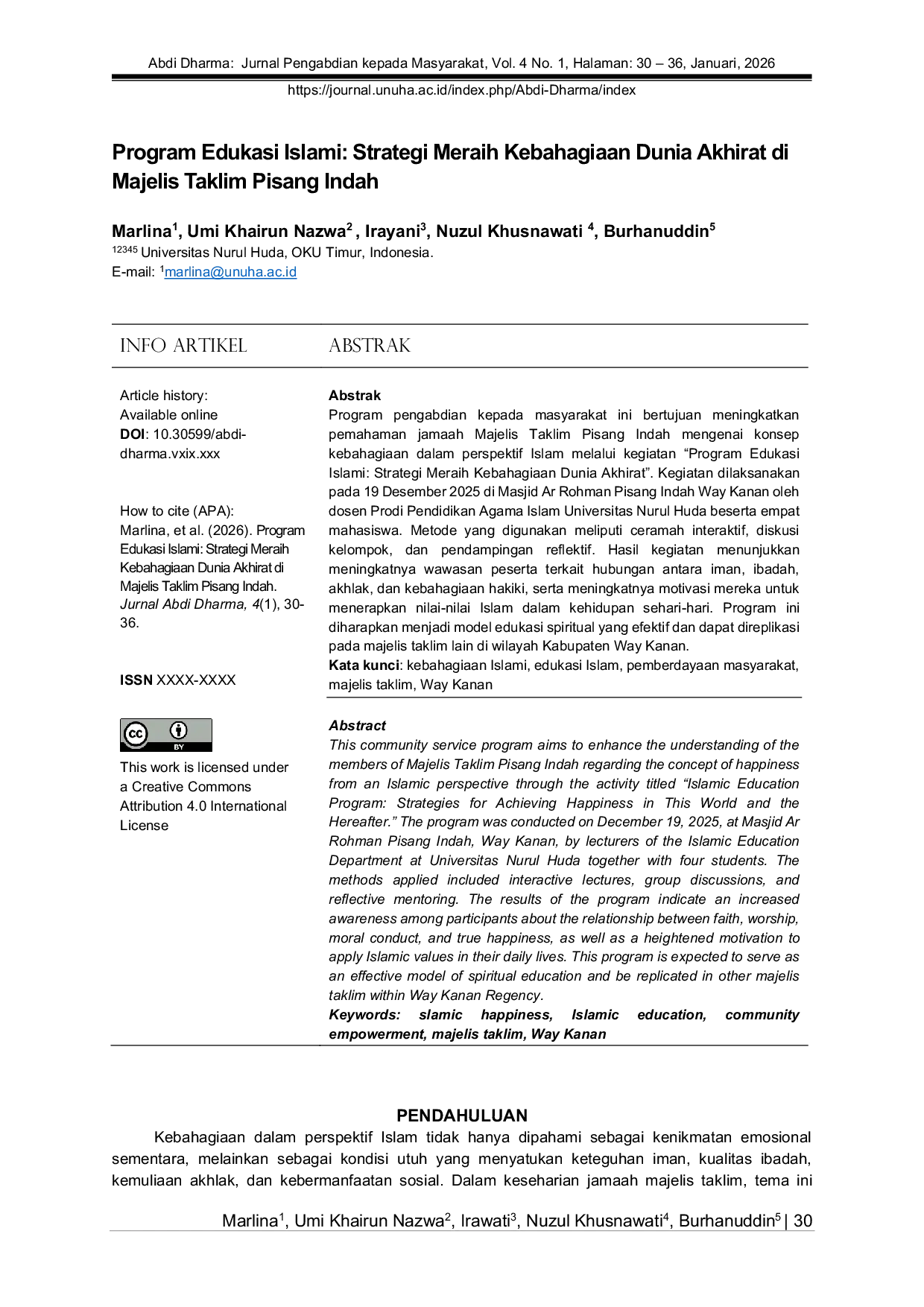 Jurnal Abdi DharmaJurnal Abdi DharmaProgram pengabdian kepada masyarakat ini bertujuan meningkatkan pemahaman jamaah Majelis Taklim Pisang Indah mengenai konsep kebahagiaan dalam perspektif Islam melalui kegiatan “Program Edukasi Islami: Strategi Meraih Kebahagiaan Dunia Akhirat. Kegiatan dilaksanakan pada 19 Desember 2025 di Masjid Ar Rohman Pisang Indah Way Kanan oleh dosen Prodi Pendidikan Agama Islam Universitas Nurul Huda beserta empat mahasiswa. Metode yang digunakan meliputi ceramah interaktif, diskusi kelompok, dan pendampingan reflektif. Hasil kegiatan menunjukkan meningkatnya wawasan peserta terkait hubungan antara iman, ibadah, akhlak, dan kebahagiaan hakiki, serta meningkatnya motivasi mereka untuk menerapkan nilai-nilai Islam dalam kehidupan sehari-hari. Program ini diharapkan menjadi model edukasi spiritual yang efektif dan dapat direplikasi pada majelis taklim lain di wilayah Kabupaten Way Kanan.