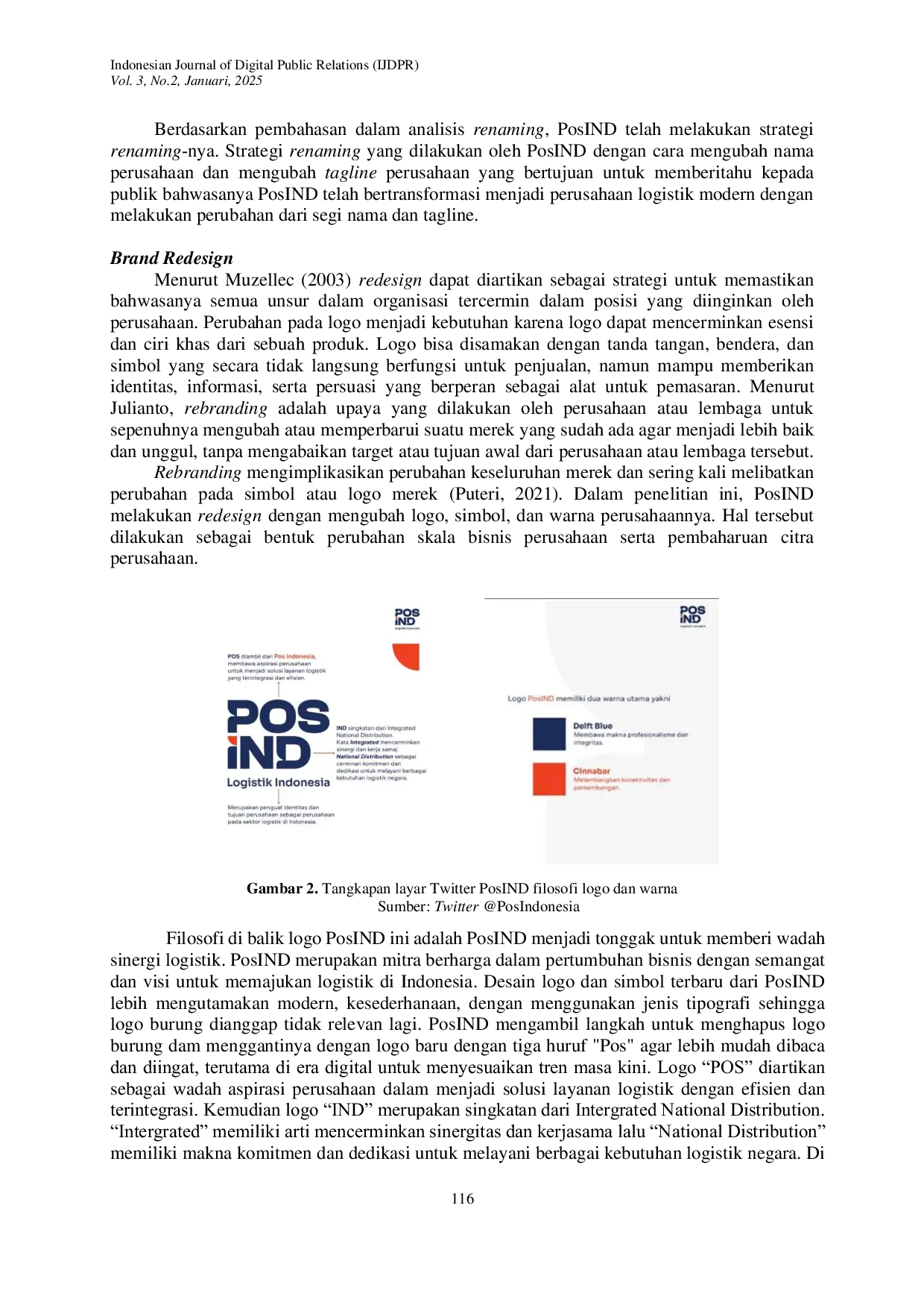 Indonesian Journal of Digital Public Relations (IJDPR)Indonesian Journal of Digital Public Relations (IJDPR)PT Pos Indonesia telah resmi melakukan perubahan identitas merek sejak 16 November 2023 menjadi PosIND. PosIND melakukan rebranding atau memperkenalkan kembali perusahaannya yang telah mengalami perubahan identitas kepada masyarakat sebagai upaya menuju badan usaha milik negara (BUMN) logistik yang modern. Hal tersebut yang membuat peneliti ingin mengetahui bagaimana strategi branding PosIND. Penelitian ini menggunakan teori strategi rebranding dari Muzellec dengan empat dimensi yaitu repositioning, renaming, redesign, dan relaunching (Muzellec & Lambkin, 2006). Metode penelitian ini menggunakan pendekatan kualitatif deskriptif dengan jenis studi kasus yang memberikan gambaran komprehensif dan kompleks melalui pandangan mendetail melalui teknik pengumpulan data observasi, wawancara, dan dokumentasi. Observasi dilakukan melalui Instagram, TikTok, Twitter, dan website PosIND. Peneliti melakukan wawancara dengan tiga informan dan melaksanakan dokumentasi. Hasil pada penelitian ini menunjukkan bahwa terdapat perubahan skala perusahaan menjadi perusahaan logistik, kompetensi keahlian karyawan, perubahan nama, tagline, logo, simbol, dan warna. PosIND juga melakukan pemberitahuan informasi mengenai rebranding perubahan identitas merek melalui beberapa platform internal seperti Wahana Pos Indonesia dan melakukan forum group discussion (FGD), serta platform eksternal perusahaan seperti media massa, media sosial perusahaan, event korporat, dan corporate social responsibillity (CSR).