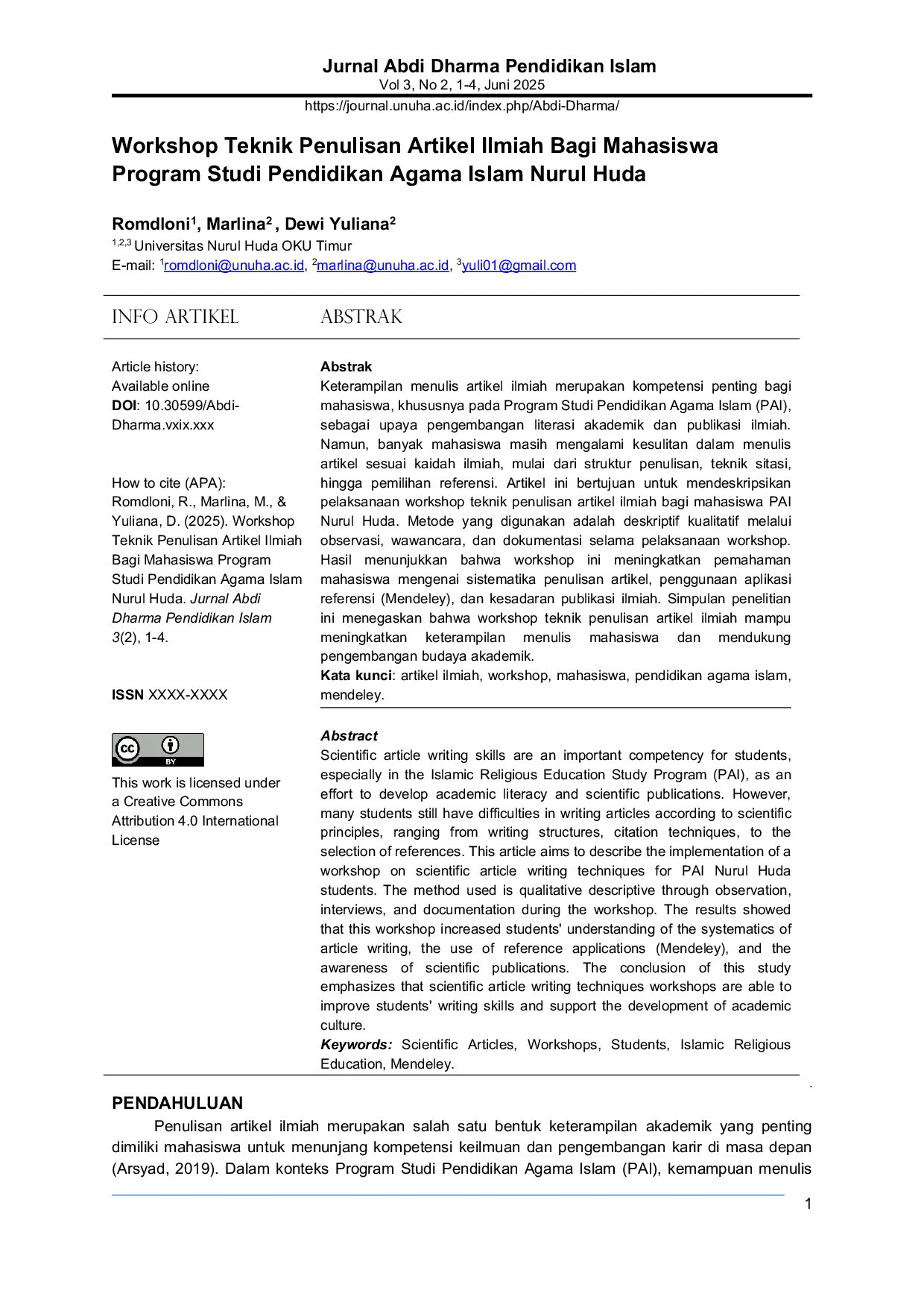 Jurnal Abdi DharmaJurnal Abdi DharmaKeterampilan menulis artikel ilmiah merupakan kompetensi penting bagi mahasiswa, khususnya pada Program Studi Pendidikan Agama Islam (PAI), sebagai upaya pengembangan literasi akademik dan publikasi ilmiah. Namun, banyak mahasiswa masih mengalami kesulitan dalam menulis artikel sesuai kaidah ilmiah, mulai dari struktur penulisan, teknik sitasi, hingga pemilihan referensi. Artikel ini bertujuan untuk mendeskripsikan pelaksanaan workshop teknik penulisan artikel ilmiah bagi mahasiswa PAI Nurul Huda. Metode yang digunakan adalah deskriptif kualitatif melalui observasi, wawancara, dan dokumentasi selama pelaksanaan workshop. Hasil menunjukkan bahwa workshop ini meningkatkan pemahaman mahasiswa mengenai sistematika penulisan artikel, penggunaan aplikasi referensi (Mendeley), dan kesadaran publikasi ilmiah. Simpulan penelitian ini menegaskan bahwa workshop teknik penulisan artikel ilmiah mampu meningkatkan dan mendukung pengembangan budaya akademik.