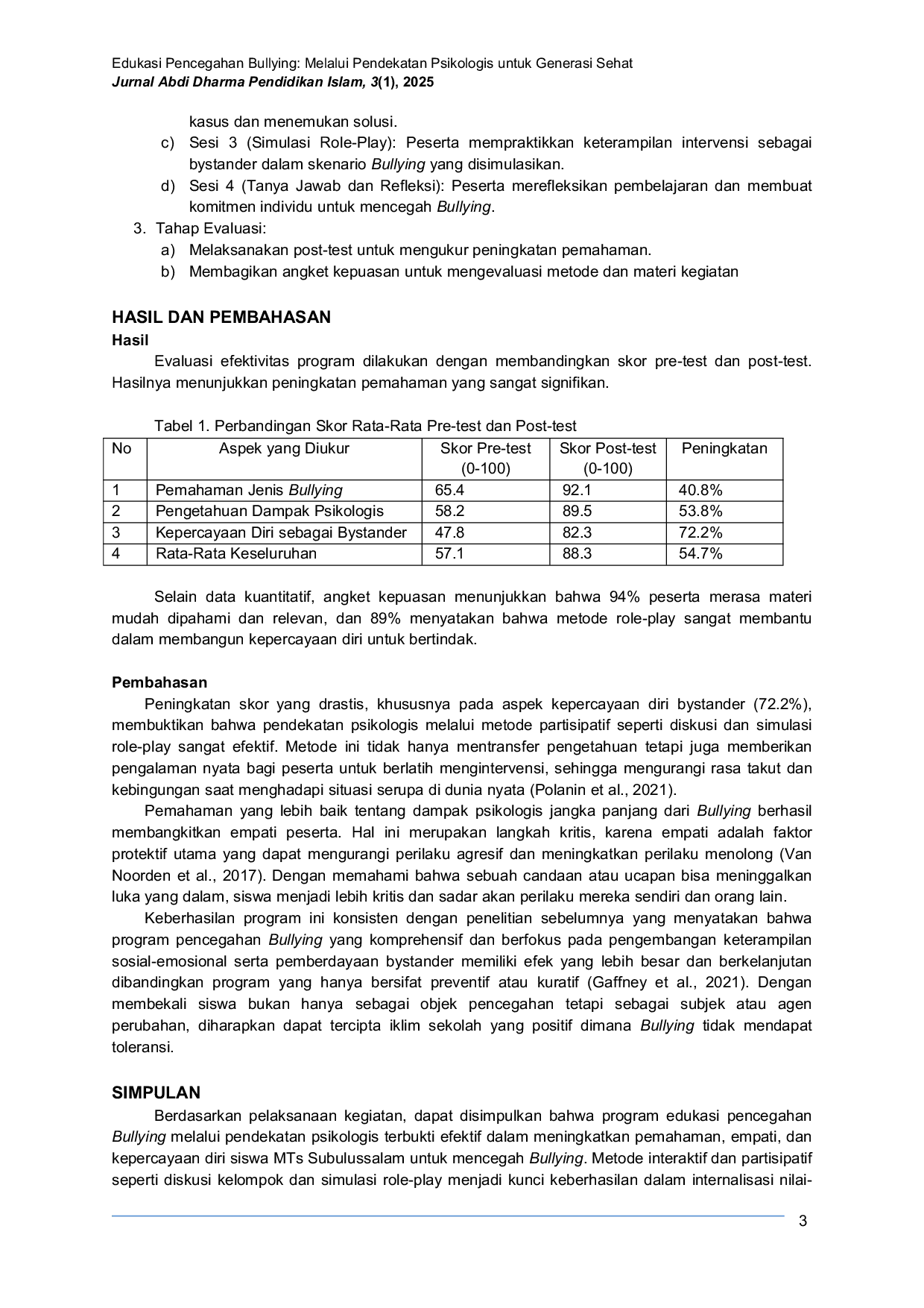 Program edukasi pencegahan Bullying melalui pendekatan psikologis terbukti efektif dalam meningkatkan pemahaman, empati, dan kepercayaan diri siswa MTs Subulussalam untuk mencegah Bullying.Metode interaktif dan partisipatif seperti diskusi kelompok dan simulasi role-play menjadi kunci keberhasilan dalam internalisasi nilai-nilai anti-Bullying.Untuk menjamin keberlanjutan, disarankan agar sekolah mengintegrasikan modul serupa ke dalam program Bimbingan Konseling (BK) secara berkala dan mengembangkan kebijakan sekolah yang jelas dan tegas terhadap Bullying, didukung oleh seluruh warga sekolah.