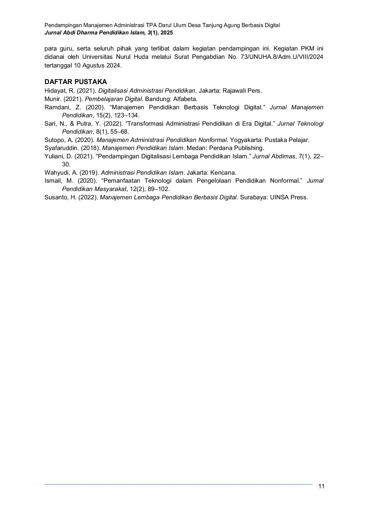 Pendampingan manajemen administrasi berbasis digital di TPA Darul Ulum Desa Tanjung Agung terbukti mampu meningkatkan efektivitas, efisiensi, dan transparansi pengelolaan lembaga.Implementasi aplikasi digital sederhana seperti Excel dan Google Drive sangat membantu dalam pencatatan data, absensi, keuangan, dan dokumentasi.Untuk keberlanjutan, perlu adanya pelatihan rutin dan dukungan perangkat yang memadai.