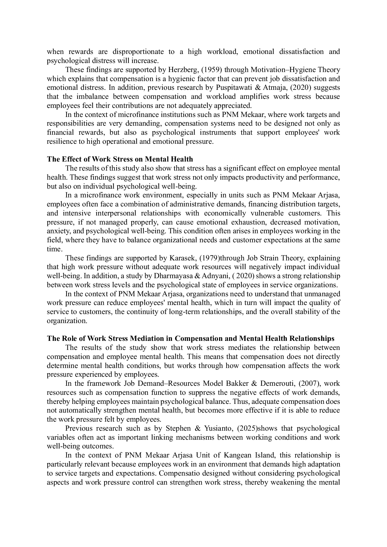 Bulletin of Management and BusinessBulletin of Management and BusinessThis study examines how compensation influences employee mental health through work stress in microfinance institutions. The research was conducted at PNM Mekaar Arjasa Unit, Kangean Island, involving 43 employees using a census approach. Data were collected through structured questionnaires and analyzed using Partial Least Squares–Structural Equation Modeling (PLS-SEM). The results show that compensation does not directly affect mental health but indirectly influences it through work stress. Fair and adequate compensation reduces work stress, which improves employees psychological well-being. Conversely, imbalanced compensation increases emotional pressure and weakens mental health. These findings confirm that work stress acts as a mediating mechanism linking compensation and mental health. The study contributes to the Job Demand–Resources framework by emphasizing the psychological role of compensation in high-pressure microfinance environments. Practically, the findings suggest that compensation policies should be integrated with stress management strategies to maintain employee well-being and organizational stability.