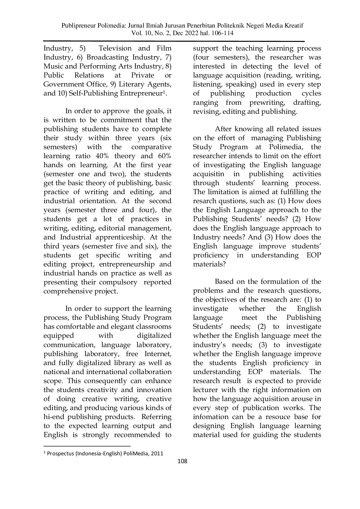 Jurnal Ilmiah PublipreneurJurnal Ilmiah PublipreneurPenelitian ini didasari oleh masalah belajar pengalaman pragmatis yang dihadapi peneliti dalam aktivitas mengajar sehari-hari dari semester pertama hingga keempat (2008-2021) di PoliMedia. Temuan pragmatis peneliti menunjukkan bahwa pengajaran bahasa Inggris untuk mahasiswa penerbitan dengan keterampilan dasar (membaca, menulis, mendengarkan, berbicara) harus sejalan dengan kompetensi dasar yang diperlukan dalam penilaian bahasa untuk keterampilan penerbitan yang diperlukan (pra-penulisan, penyusunan, revisi, editing, dan penerbitan). Namun, untuk memastikan temuan pragmatis tersebut, diperlukan analisis akademik melalui metodologi penelitian akademik, termasuk: pengaturan dan waktu, desain penelitian, populasi dan sampel, instrumen pengumpulan data, dan analisis data. Penelitian ini menggunakan pendekatan kualitatif melalui penglihatan, pengamatan, diskusi, dan studi terhadap dokumen terkait yang diambil dari kuesioner, wawancara, simulasi, dan diskusi kelompok terfokus di antara dosen. Data menunjukkan berbagai tingkat akuisisi bahasa (membaca, menulis, mendengarkan, berbicara) yang ditemukan dalam pra-penulisan, penyusunan, revisi, editing, dan penerbitan. Sementara itu, terdapat tujuh belas keterampilan teknis mahasiswa yang perlu didukung dalam proses belajar, yaitu: 1) keterampilan kerja tim; 2) keterampilan komunikasi lisan; 3) keterampilan pemecahan masalah; 4) keterampilan penanganan pelanggan; 5) keterampilan manajemen; 6) keterampilan pengguna IT umum; 7) keterampilan teknis dan praktis; 8) keterampilan administrasi kantor; 9) keterampilan komunikasi tertulis; 10) keterampilan literasi; 11) keterampilan numerasi; 12) keterampilan profesional IT; 13) keterampilan bahasa asing; 14) kemampuan bergulat dengan tata bahasa; 15) keterampilan membaca cepat; 16) keterampilan mencatat; dan 17) keterampilan negosiasi.
