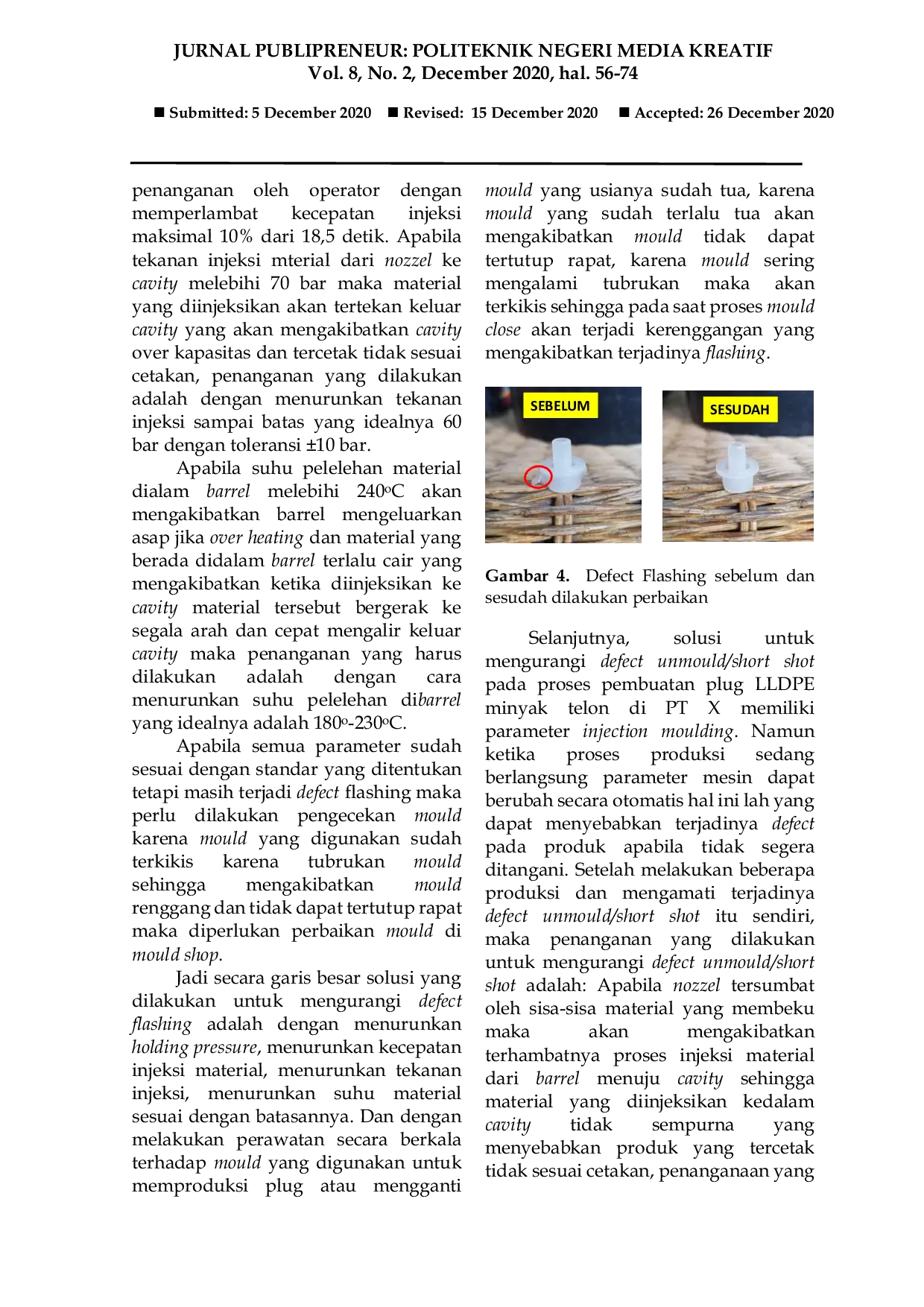 Jurnal Ilmiah PublipreneurJurnal Ilmiah PublipreneurJenis kemasan plastik yang populer di kalangan masyarakat adalah kemasan botol, kemasan botol plastik selalu dilengkapi tutup botol. Sebagian masyarakat hanya mengetahui bagian tutup botol hanya pada bagian tutup luarnya saja padahal tutup kemasan botol plastik terdiri dari dua macam, yaitu tutup luar (cap) dan tutup dalam (plug). Material plastik yang digunakan untuk membuat plug yaitu Linear Low Density Polyethylene (LLDPE), plug minyak telon diproduksi dengan menggunakan mesin injection moulding, dengan cara memasukan biji plastik ke dalam hopper lalu dipanaskan oleh barrel, biji plastik yang sudah mencair akan diinjeksikan ke dalam mould (cetakan). Dalam proses pembuatan plug minyak telon ditemukan adanya defect. Dari hasil pengamatan diketahui beberapa jenis defect yang terjadi pada saat proses produksi plug LLDPE minyak telon antara lain black dot, flashing, dan unmould/short shot. Defect yang terjadi pada saat proses produksi plug minyak telon disebabkan oleh kerusakan, kontaminasi, dan ketidaksesuaian dalam pengaturan parameter mesin. Tujuan dari penelitian ini untuk mengetahui penyebab, dan solusi dari defect yang terjadi pada plug LLDPE minyak telon dengan mesin injection moulding haitian 1600MA di PT X. Beberapa solusi yang dilakukan untuk mengurangi defect yang terjadi pada plug LLDPE minyak telon adalah dengan membersihkan tempat penampungan material, memperbaiki atau mengganti mould, membersihkan hopper sebelum memasukan material, dan melakukan set up parameter barrel 180-230oC, inject pressure 60 bar, holding pressure 30 bar, speed 17,8 detik.