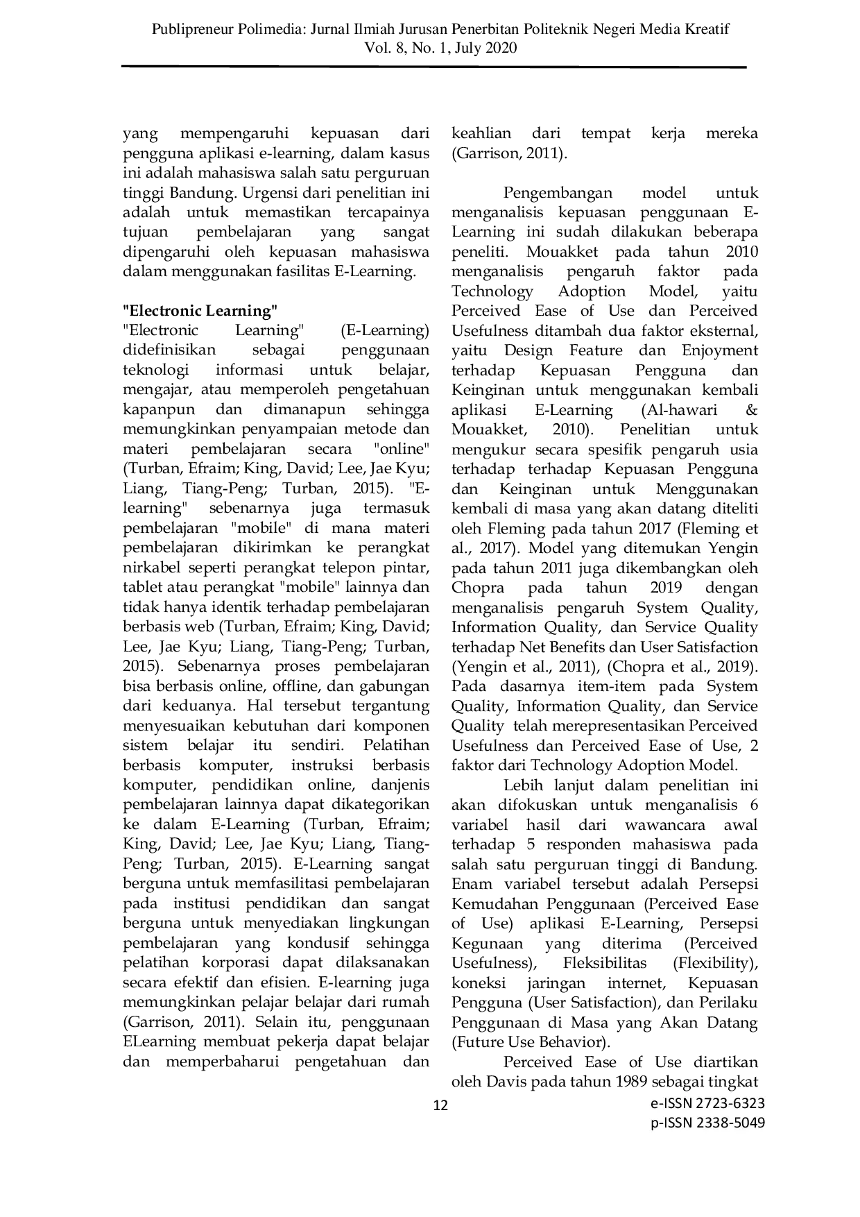 Jurnal Ilmiah PublipreneurJurnal Ilmiah PublipreneurPandemi Corona sudah mewabah hampir di seluruh belahan dunia. Indonesia menjadi salah satu negara terdampak. Sektor pendidikan menjadi salah satu sektor yang terdampak dan merubah proses pembelajaran yang awalnya mayoritas didominasi pembelajaran konvensional menjadi pembelajaran berbasis E-Learning. Perubahan yang bisa dikatakan mendadak ini membuat seluruh komponen pembelajaran, terutama pengajar dan peserta ajar harus beradaptasi menggunakan fasilitas yang tersedia. Namun, perubahan yang sangat mendadak ini pasti menimbulkan hambatan atas tercapainya tujuan pembelajaran. Oleh karena itu, dirasa penting untuk mengevaluasi proses pembelajaran lewat fasilitas e-learning ini sehingga peserta ajar bisa merasa puas dan tujuan pembelajaran tercapai.