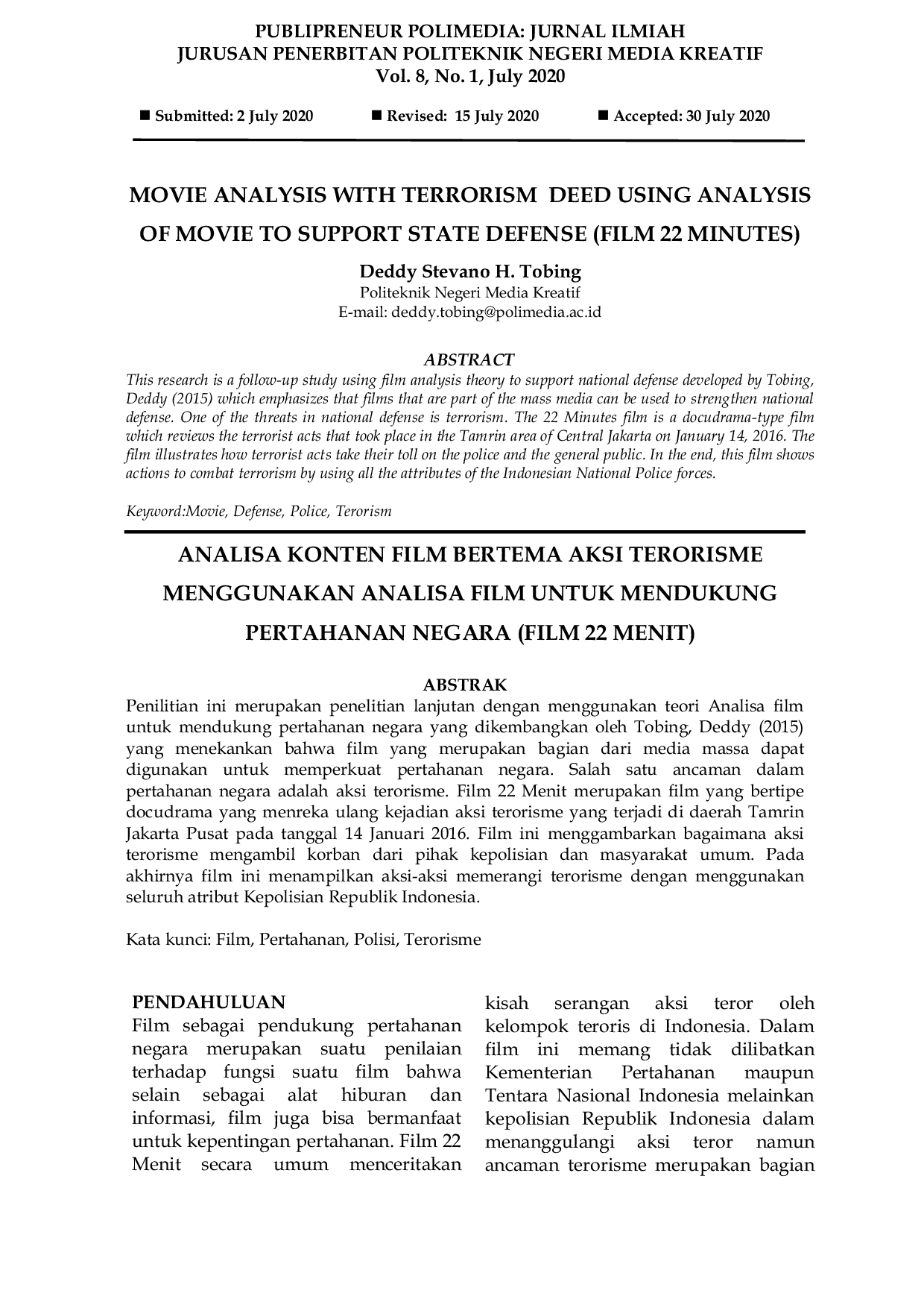 Jurnal Ilmiah PublipreneurJurnal Ilmiah PublipreneurPenelitian ini merupakan penelitian lanjutan dengan menggunakan teori Analisa film untuk mendukung pertahanan negara yang dikembangkan oleh Tobing, Deddy (2015) yang menekankan bahwa film yang merupakan bagian dari media massa dapat digunakan untuk memperkuat pertahanan negara. Salah satu ancaman dalam pertahanan negara adalah aksi terorisme. Film 22 Menit merupakan film yang bertipe docudrama yang mereka ulang kejadian aksi terorisme yang terjadi di daerah Tamrin Jakarta Pusat pada tanggal 14 Januari 2016. Film ini menggambarkan bagaimana aksi terorisme mengambil korban dari pihak kepolisian dan masyarakat umum. Pada akhirnya film ini menampilkan aksi-aksi memerangi terorisme dengan menggunakan seluruh atribut Kepolisian Republik Indonesia.