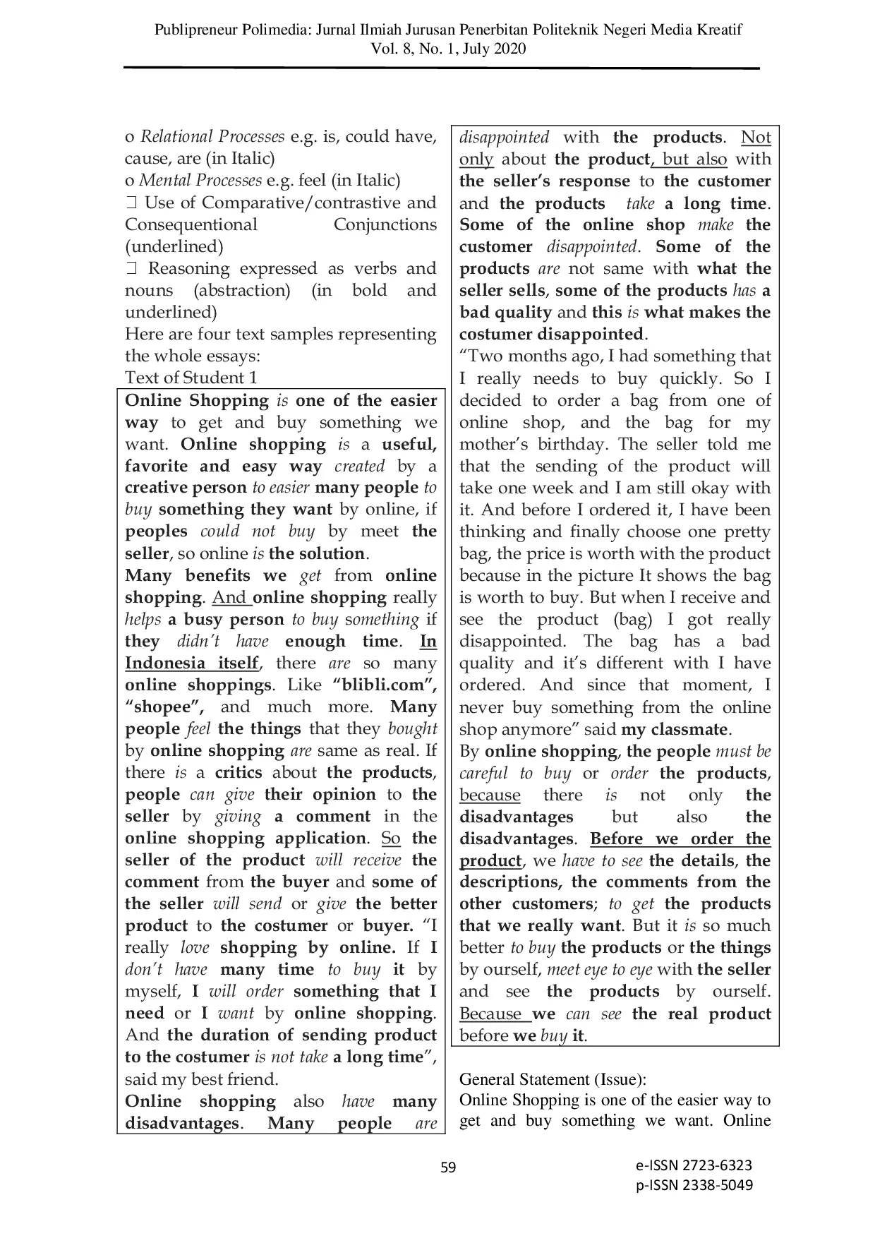 Ciri linguistik dominan dalam seluruh teks adalah partisipan manusia dan non-manusia generik, yang sesuai dengan fenomena yang dibahas dalam tulisan mahasiswa.Semua mahasiswa mengikuti aturan penulisan struktur generik, termasuk argumen pendukung, argumen penentang, serta kesimpulan atau rekomendasi.Mahasiswa telah menerapkan seluruh ciri linguistik sesuai yang telah mereka pelajari dalam penulisan teks diskusi.